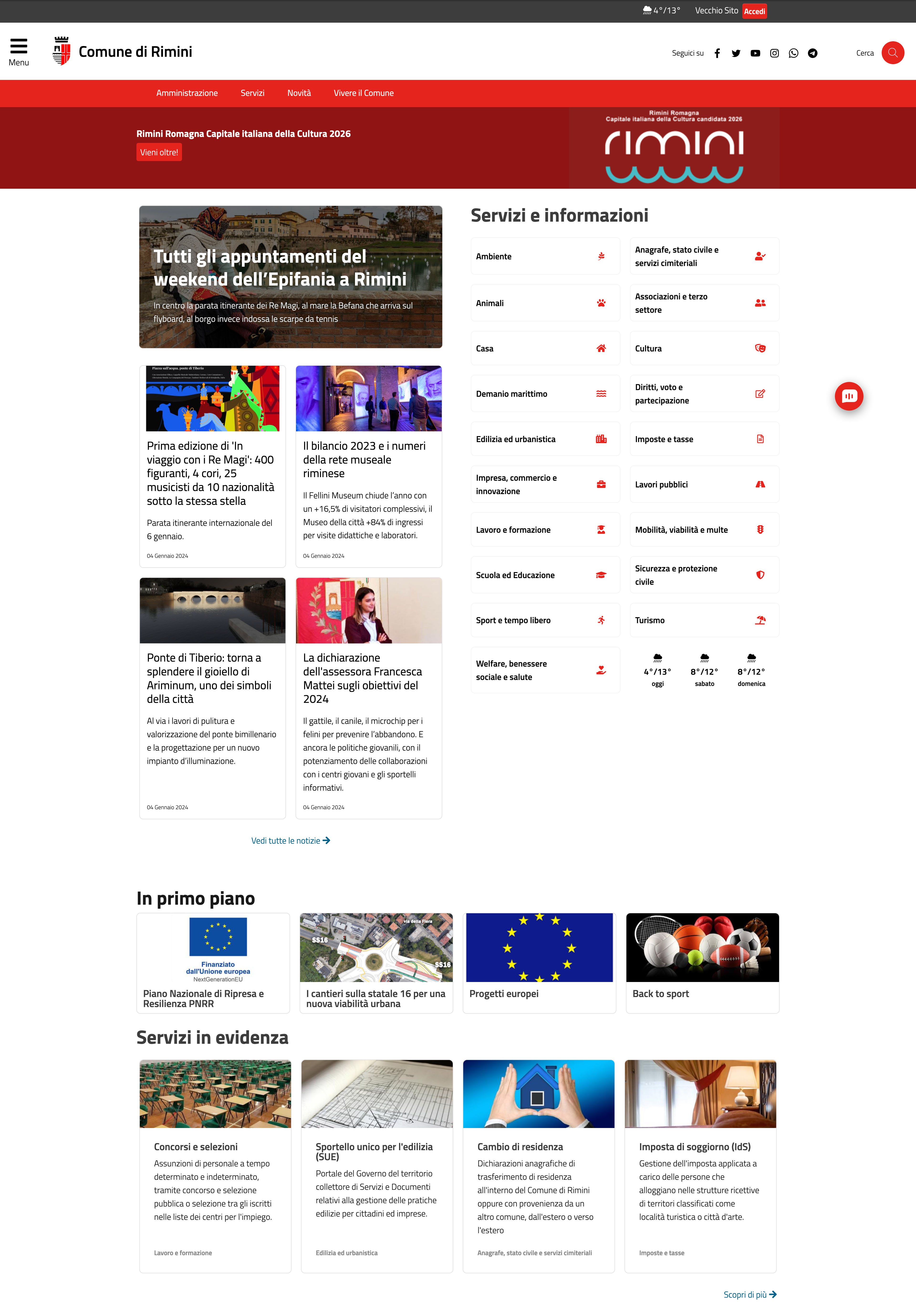 Le informazioni sui servizi anagrafici e quelle sui bandi di concorso e poi quelle sul servizio TARI, le allerte meteo e la consultazione dell'elenco delle pratiche edilizie. Sono questi i contenuti più ricercati nel 2023 sul sito istituzionale del Comune di Rimini www.comune.rimini.it che chiude l’anno mandando in archivio un boom di accessi, incoronato anche dalle ottime performance degli altri siti comunali come ad esempio quello turistico e quelli che ruotano attorno alla galassia culturale