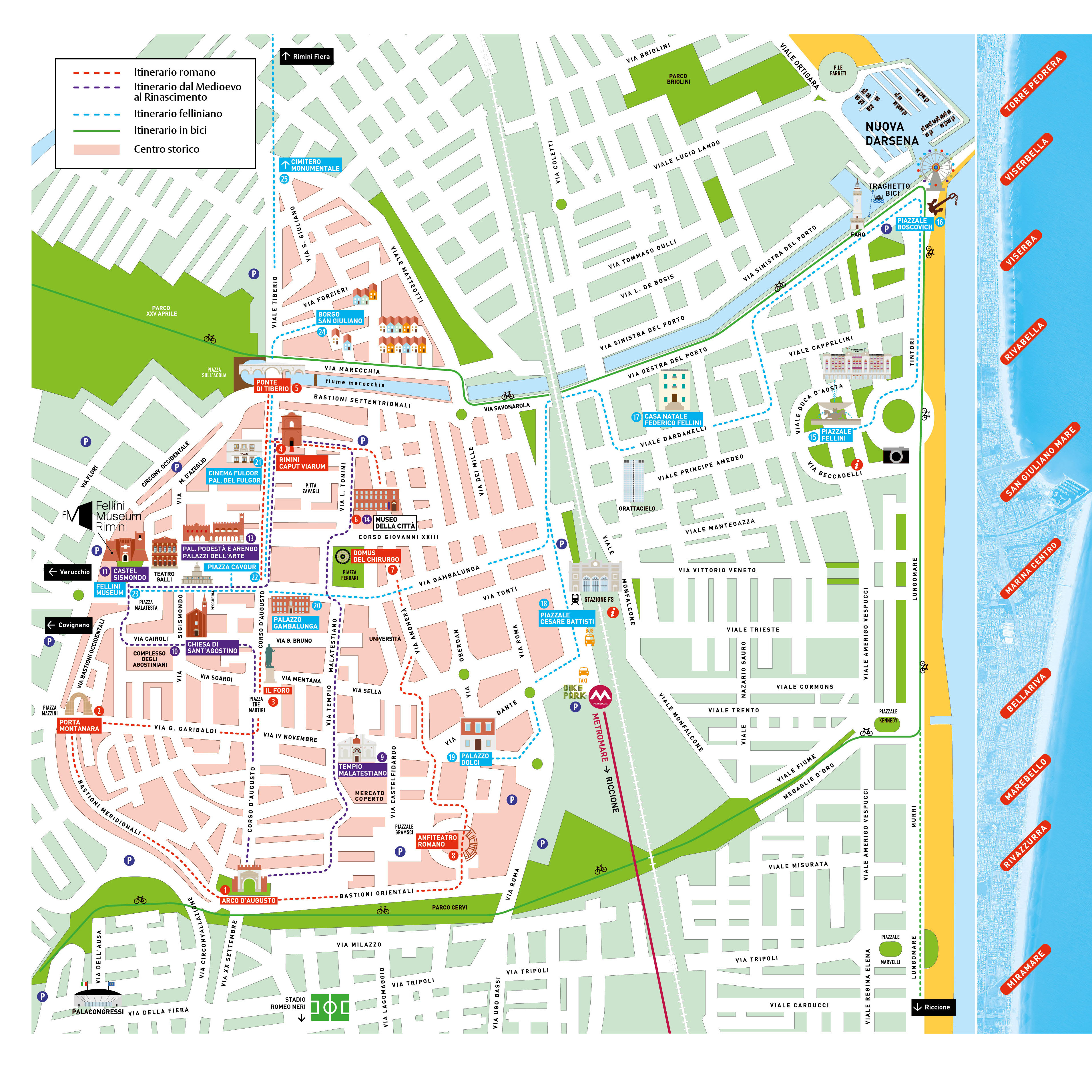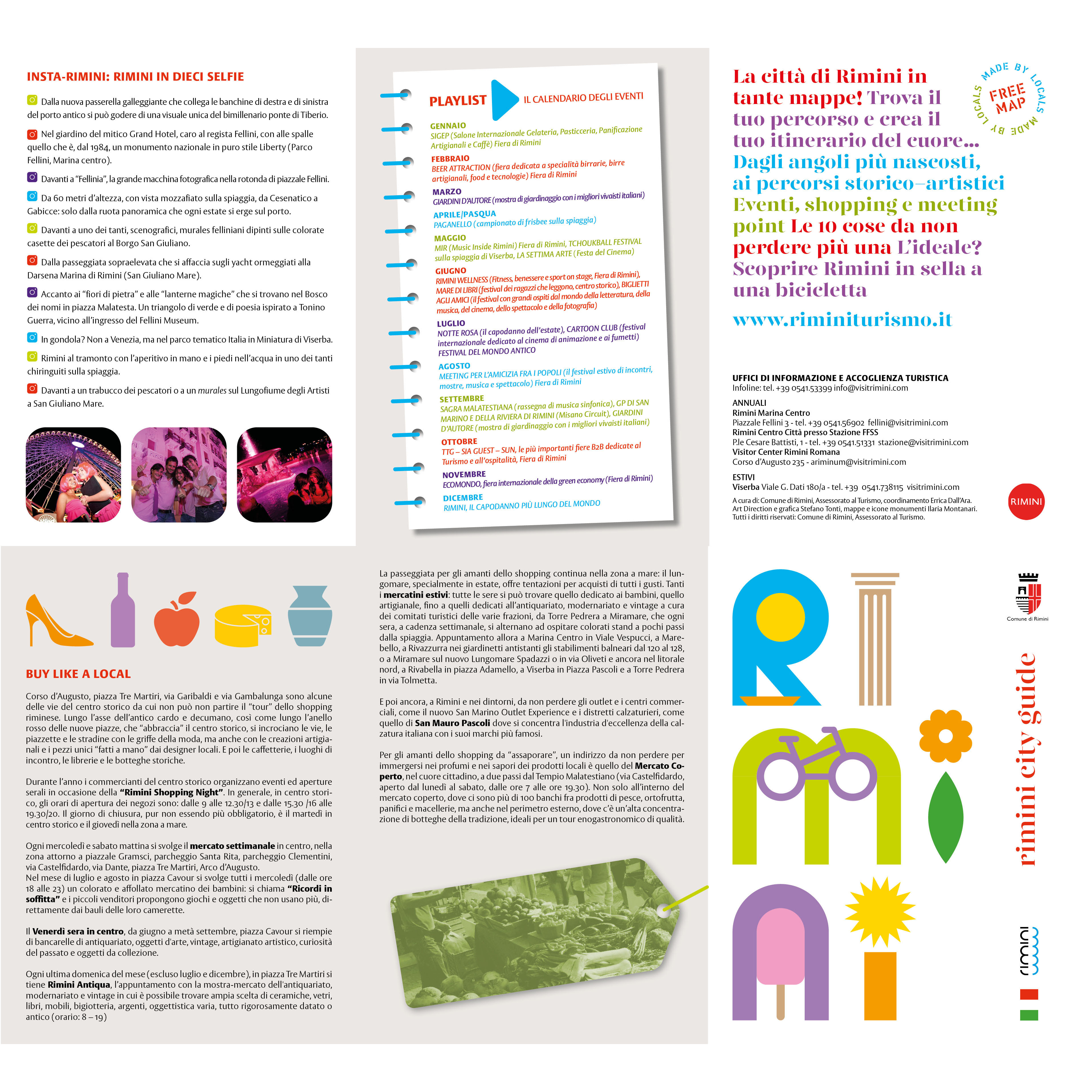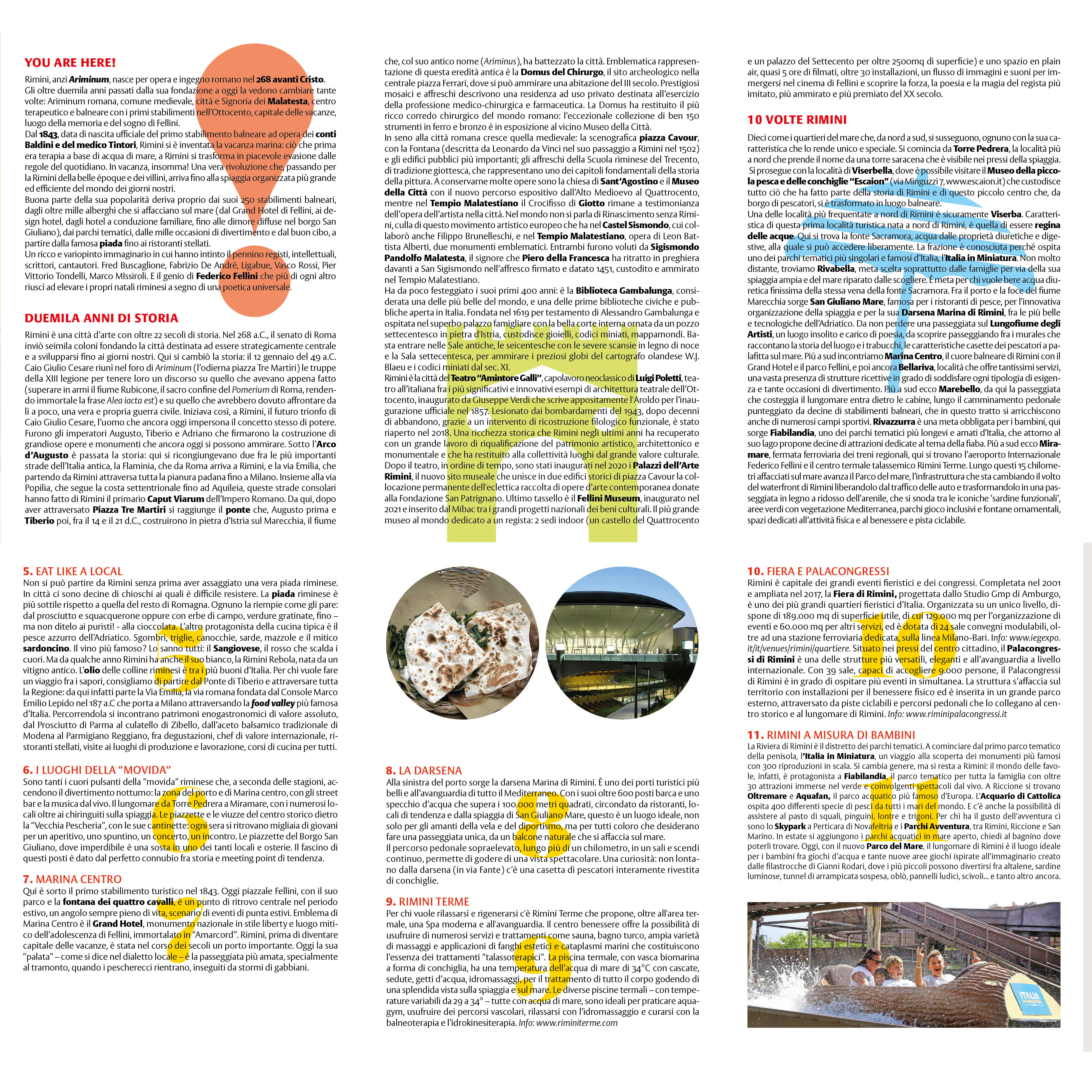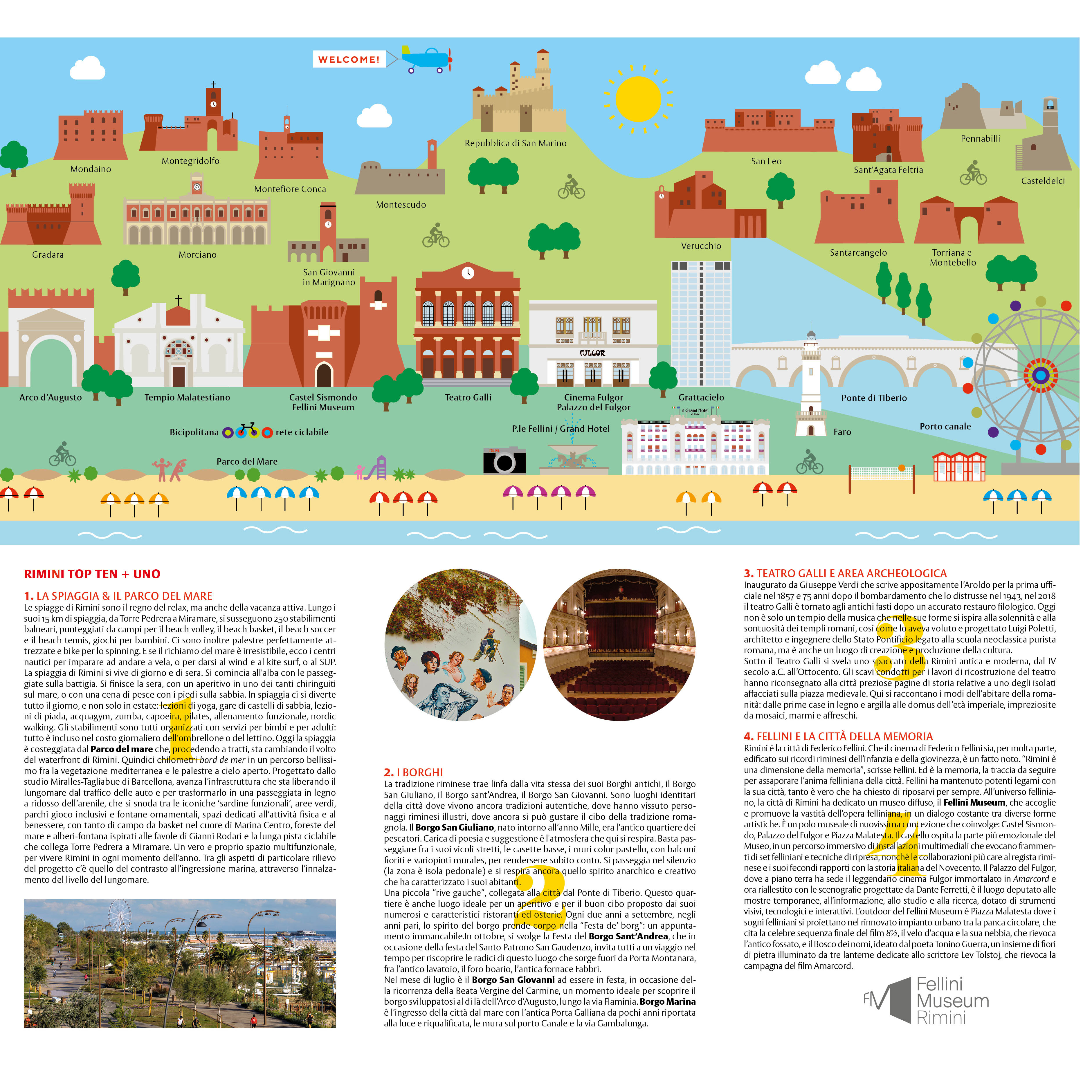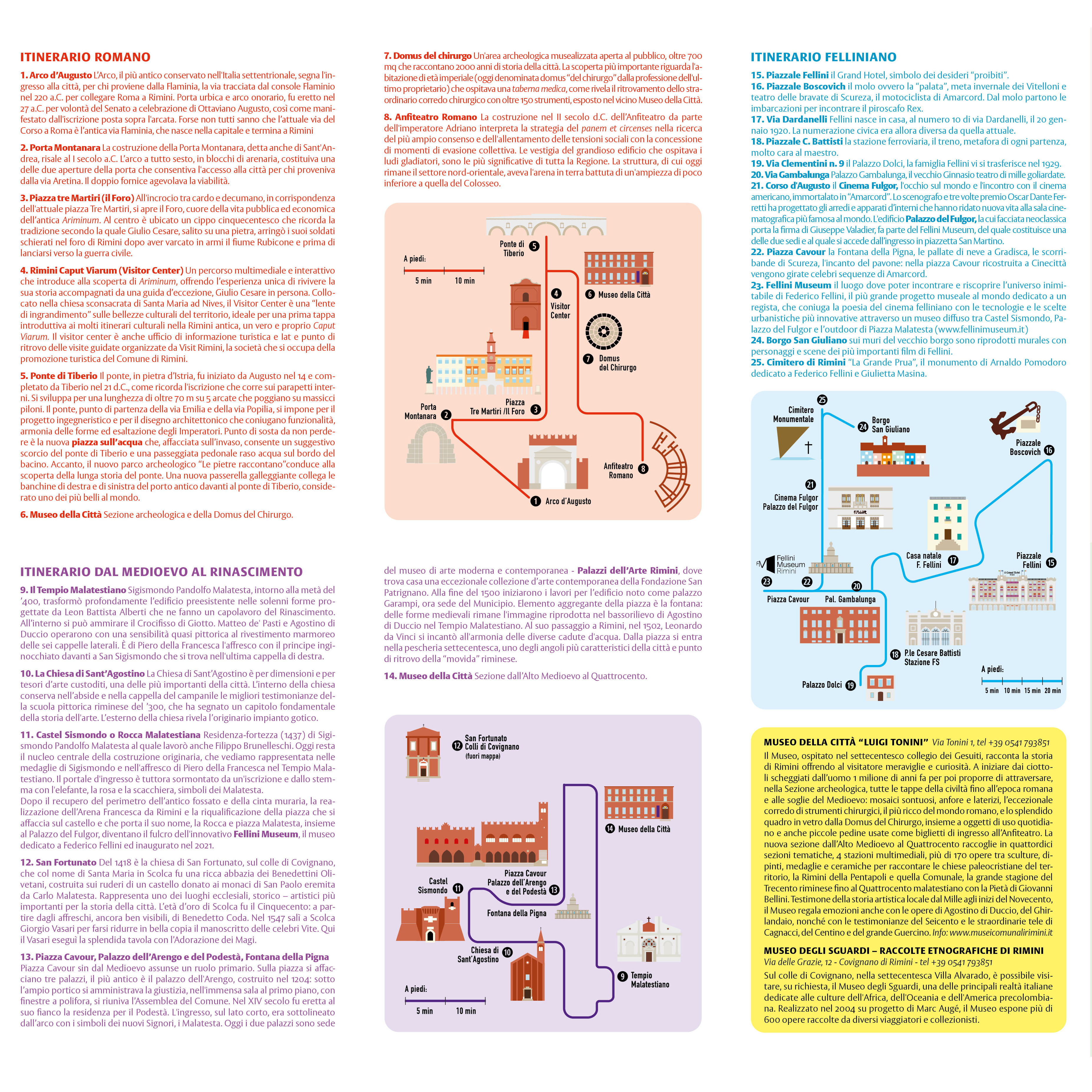 Oltre alla planimetria del centro cittadino con le miniature dei monumenti, la guida propone 3 itinerari tematici, romano, quello dal medioevo al rinascimento, il tour felliniano , alcuni spunti per le escursioni nell’entroterra e una guida sintetica per far scoprire l'anima della città, con le 10 cose da non perdere + una.