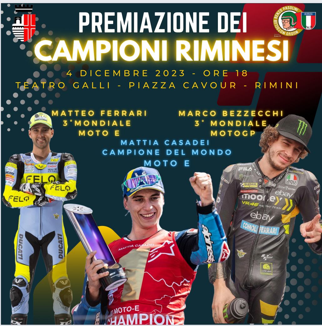 Il 4 dicembre alle ore 18 la “Premiazione dei Campioni riminesi”: l’abbraccio di Rimini a Marco Bezzecchi, Mattia Casadei e Matteo Ferrari, i piloti riminesi che sono saliti sul podio nel corso dell’ultima stagione motociclistica della MotoGp