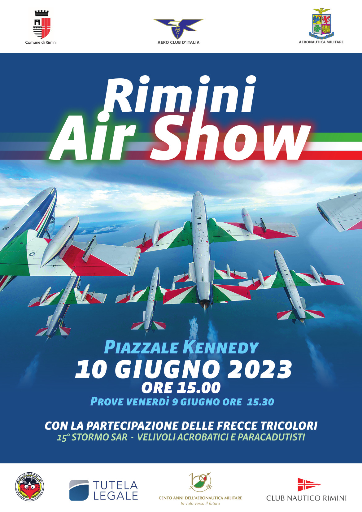 Nell’anno del centenario della costituzione dell'Aeronautica Militare, la pattuglia acrobatica farà tappa ancora una volta in Riviera e spargerà il tricolore nel cielo di Rimini mostrando alla folla, le acrobazie e le scenografie che rendono le Frecce Tricolori famose nel mondo. Venerdì 9 giugno si svolgeranno le prove, mentre l’esibizione ufficiale ci terrà il sabato pomeriggio.