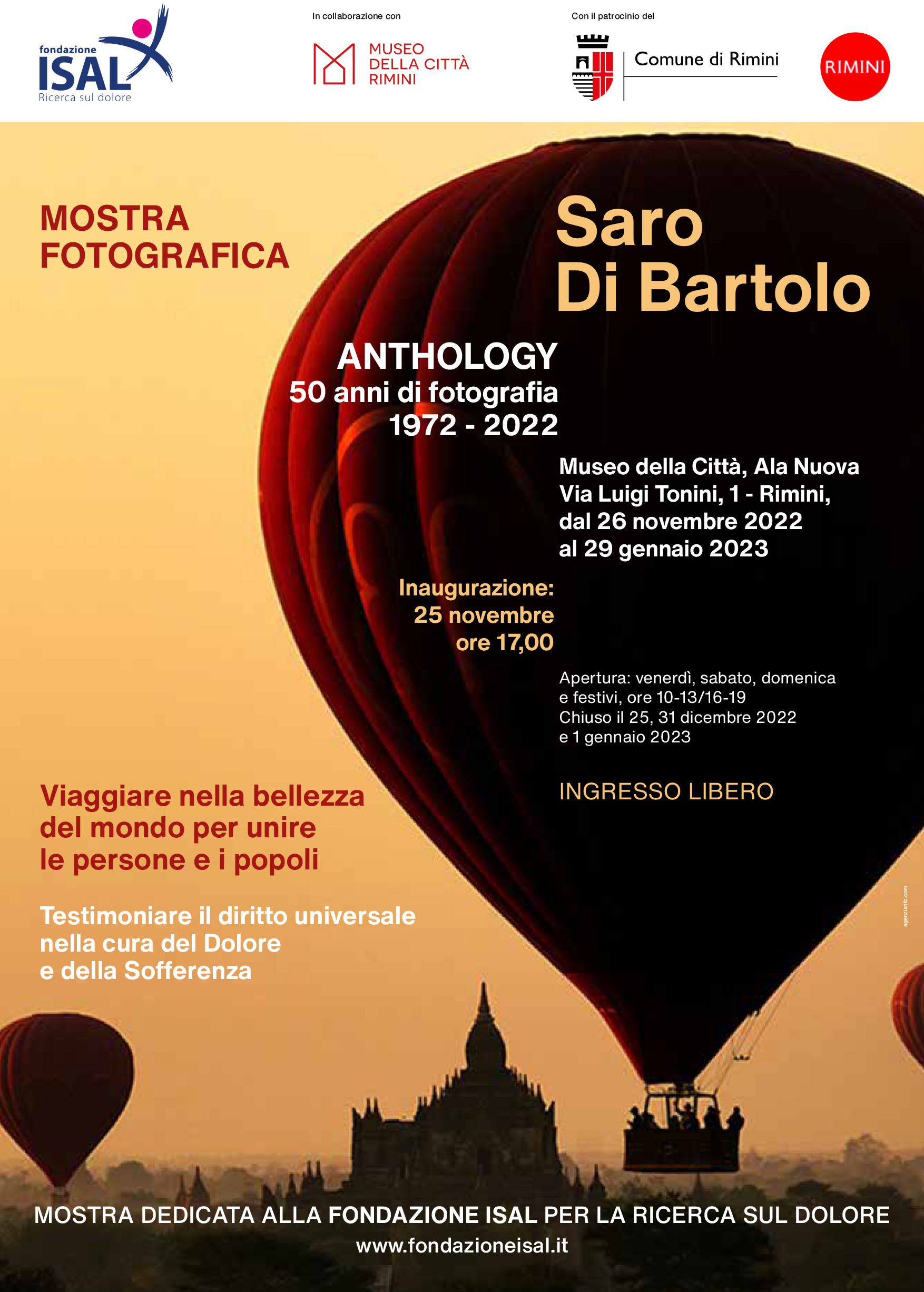 Mostra Fotografica dell'artista Saro Di Bartolo che espone 175 opere attraverso le quali, partendo dalla sua Rimini, il fotografo racconta la propria evoluzione artistica nell’arco di ben cinque decenni. La mostra è dedicata alla fondazione Isal per la ricerca sul dolore ed è organizzata e gestita dalla Fondazione stessa.