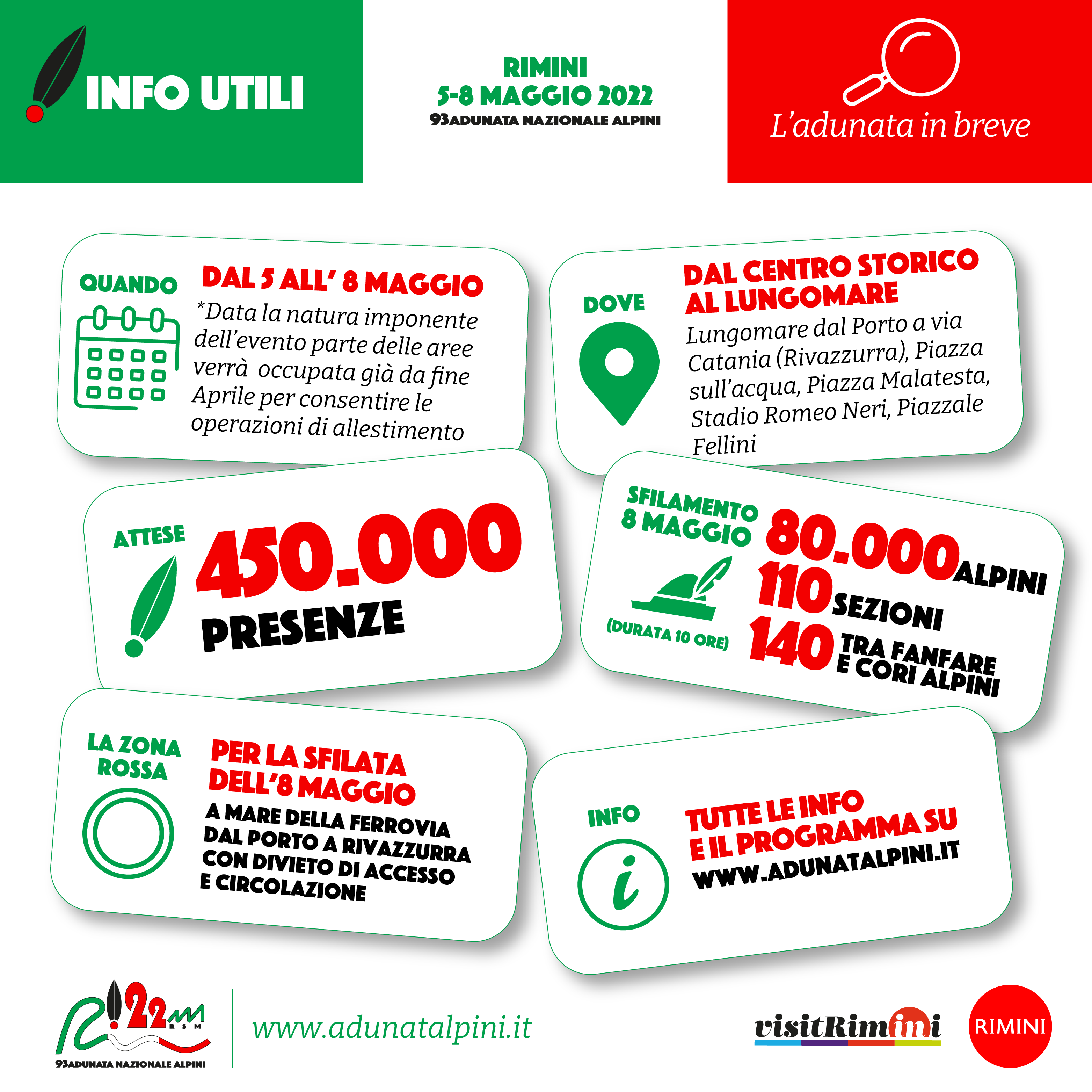 VisitRimini sarà a disposizione durante il periodo dell’Adunata con l’apertura di 4 Uffici IAT: Parco Fellini, Piazza Marvelli, Stazione e Visitor Center per accogliere ed assistere i partecipanti e i loro accompagnatori. È attivo il numero di telefono dedicato 0541/1648069, nonché l’indirizzo email: alpini2022@visitrimini.com