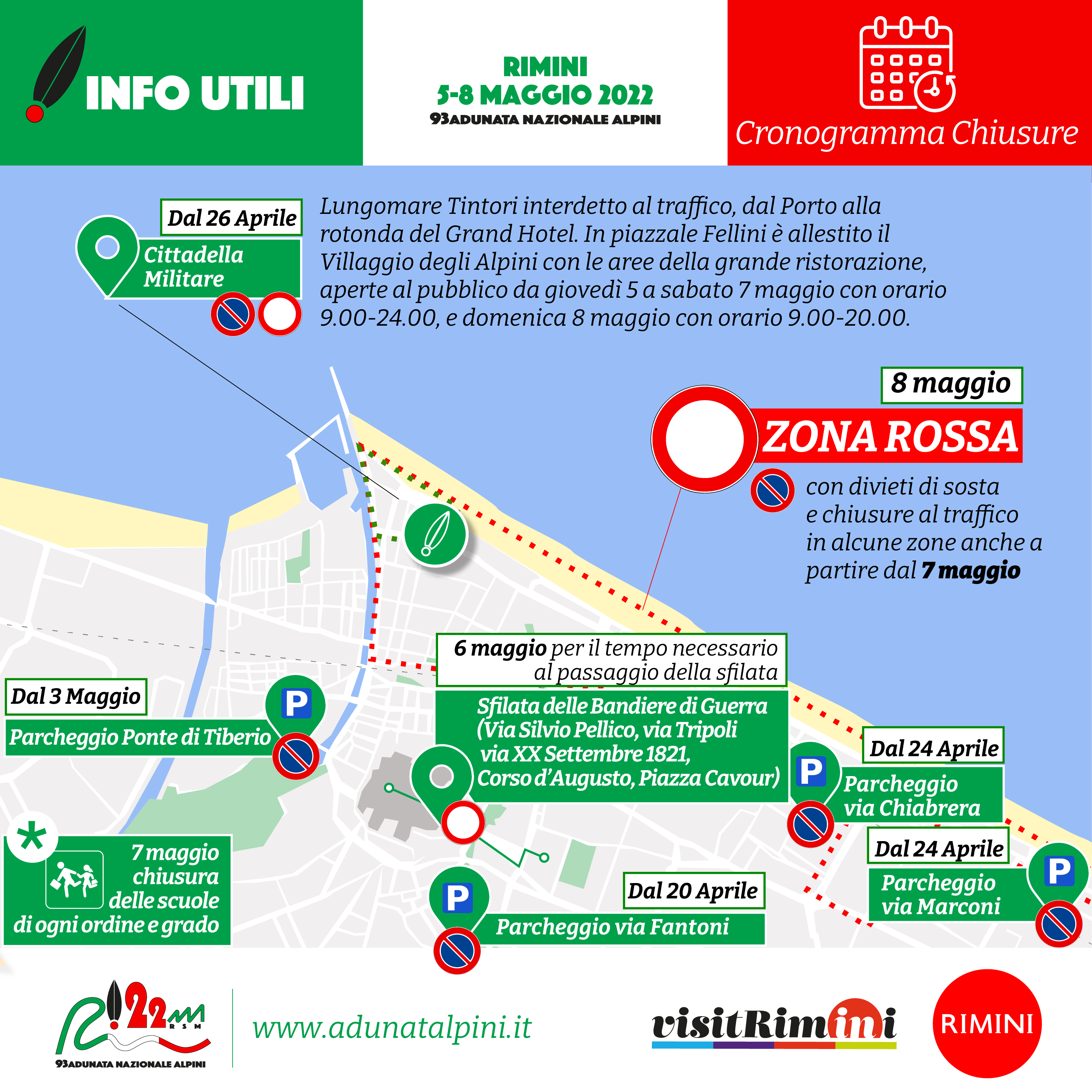 L’area Rossa è l’area a mare della ferrovia, da via Destra del Porto a via Catania a Rivazzurra, includendo anche l’area di ammassamento che interesserà le vie: Regina Elena (da Piazzale Gondar a Piazzale Toscanini), Chiabrera (da via Firenze alla rotonda Settembrini/Marradi); Firenze, Mazzoni (da Piazzale Gondar a via Portofino); via Portofino. La zona "rossa" scatterà domenica 8 maggio in occasione della Sfilata degli Alpini (a partire dalle ore 24.00 di sabato 7 fino alle ore 24 di domenica 8 maggio) e sarà interdetta anche alle auto dei residenti ed ai mezzi pubblici, con il divieto di circolazione a tutti i veicoli. All’interno di tale area sarà vietato per la giornata di domenica anche l’accesso di mezzi di approvvigionamento per le attività e i pubblici esercizi presenti ed il transito dei mezzi già stazionanti all’interno di tale area. Con le medesime disposizioni sarà vietata la mobilità con auto e altri mezzi dalle attività alberghiere insistenti all’interno della zona.
