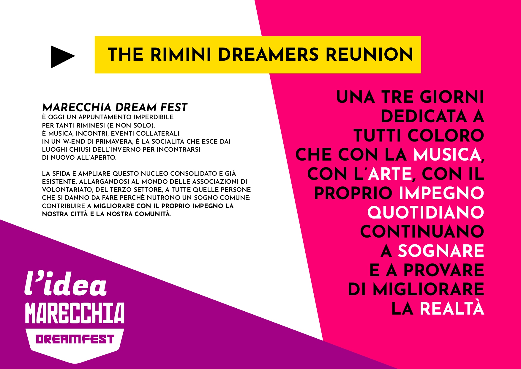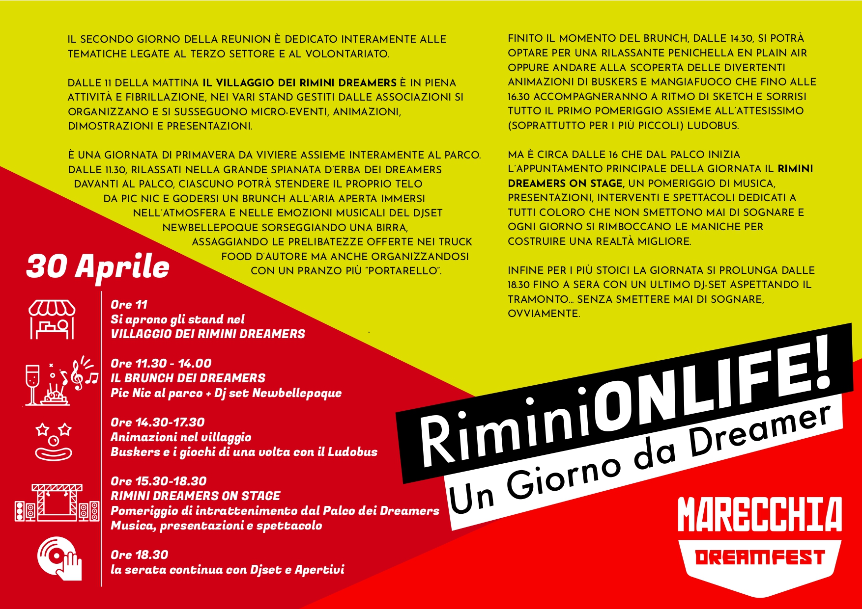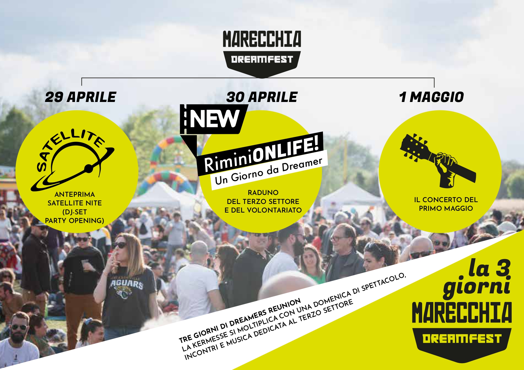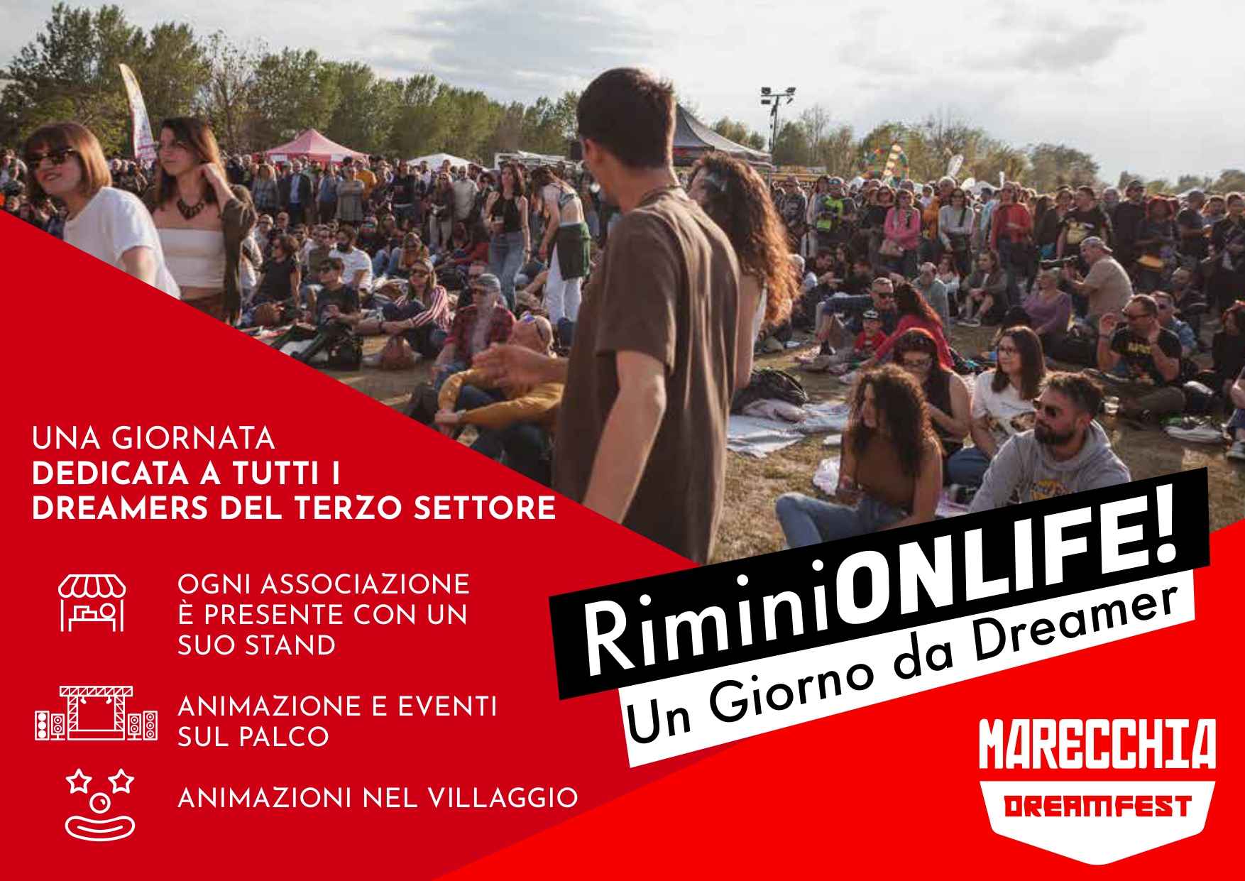 È questo il senso del grande evento di 'Rimini OnLife' all’interno del Marecchia Dream Fest, che in questa edizione si amplia, diventando un unicum in Italia: una tre giorni dedicata alla musica, alla socialità, alla primavera e al divertimento, ma soprattutto a tutti coloro che con il loro impegnano quotidiano, giorno dopo giorno, provano a migliorare la nostra società. Si tratta del cosiddetto terzo settore e delle realtà che gravitano attorno al mondo del volontariato, che durante questa kermesse avranno la possibilità di avere un proprio stand, di incontrare i propri colleghi e di presentarsi alla città. Tre giorni di riunione tra i ‘dreamers’, ovvero tra coloro che, attraverso il loro operato giornaliero, sognano, progettano e piantano i semi per cambiare in meglio la comunità riminese.