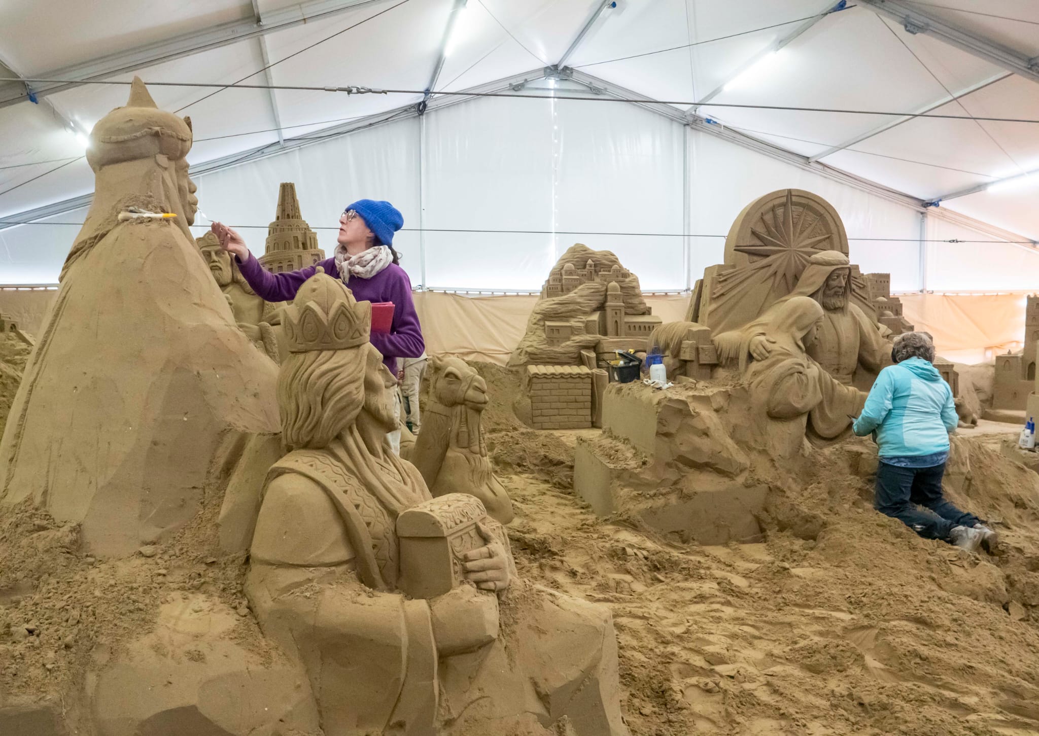 Prende forma da sabato 30 novembre il grande presepe di sabbia scolpito davanti al mare d’inverno. Un Presepe artistico di sabbia che occupa una superficie di 500 metri quadrati sulla spiaggia libera di Piazzale Boscovich, all’interno di una tensostruttura coperta. E’ composto da oltre 20 gruppi scultorei formati da sculture di dimensione variabile fra 1.5 metri e fino a oltre 5 m di altezza che vanno ad integrarsi all’interno di un’ambientazione tradizionale natalizia. Sono sei gli scultori della sabbia, provenienti da diversi paesi d’Europa, che hanno modellato la sabbia con l’acqua per creare le opere giganti che vanno a comporre la Natività con i pastori, gli animali e la vita del villaggio con artigiani e personaggi che animano gli scenografici gruppi scultorei. E per i più piccoli, una sorpresa speciale: un presepe a loro dedicato, con i personaggi dei loro fumetti preferiti.