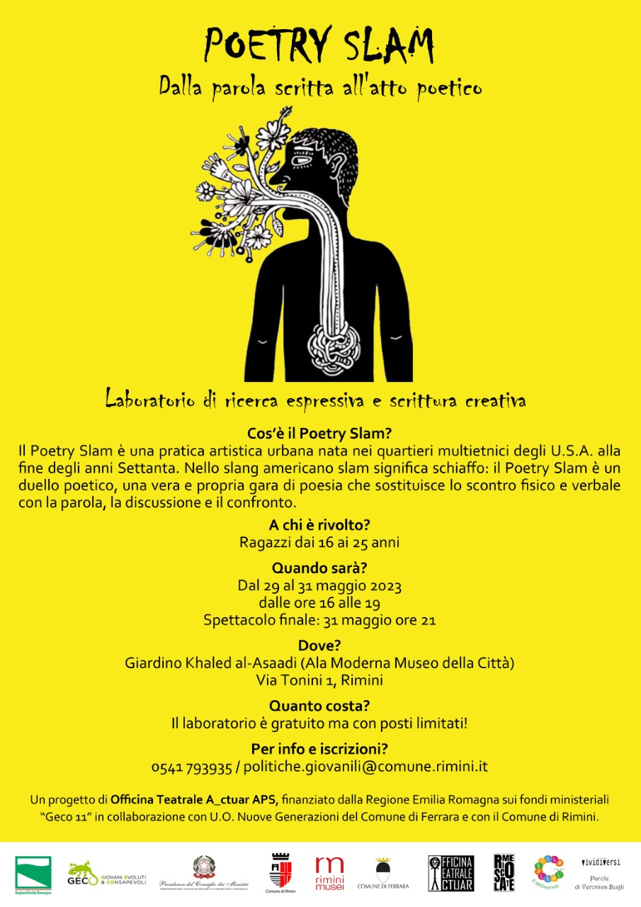 Dal 29 al 31 maggio a Rimini si terrà  il 'Poetry Slam – Dalla parola scritta all'atto poetico', un laboratorio di scrittura creativa promosso da Officina Teatrale Actuar che si ispira al duello poetico nato come pratica artistica urbana nei quartieri multietnici del Bronx alla fine degli anni Settanta. Una pratica che vuole spingere i partecipanti a mettersi in discussione elaborando il conflitto, lo scontro e il disaccordo attraverso attività che mirano alla risignificazione degli stessi tramite l'espediente del ‘duello’ poetico. Momento cardine del percorso sarà poi lo spettacolo finale, il 'Poetry Slam', una sorta di gara scanzonata dove il pubblico è chiamato a partecipare in qualità di giurato sotto la guida degli 'mc', i maestri di cerimonia. I partecipanti si sfideranno a suon di rime, ma alla fine a vincere sarà la poesia e la comunità che attorno a essa si è radunata.