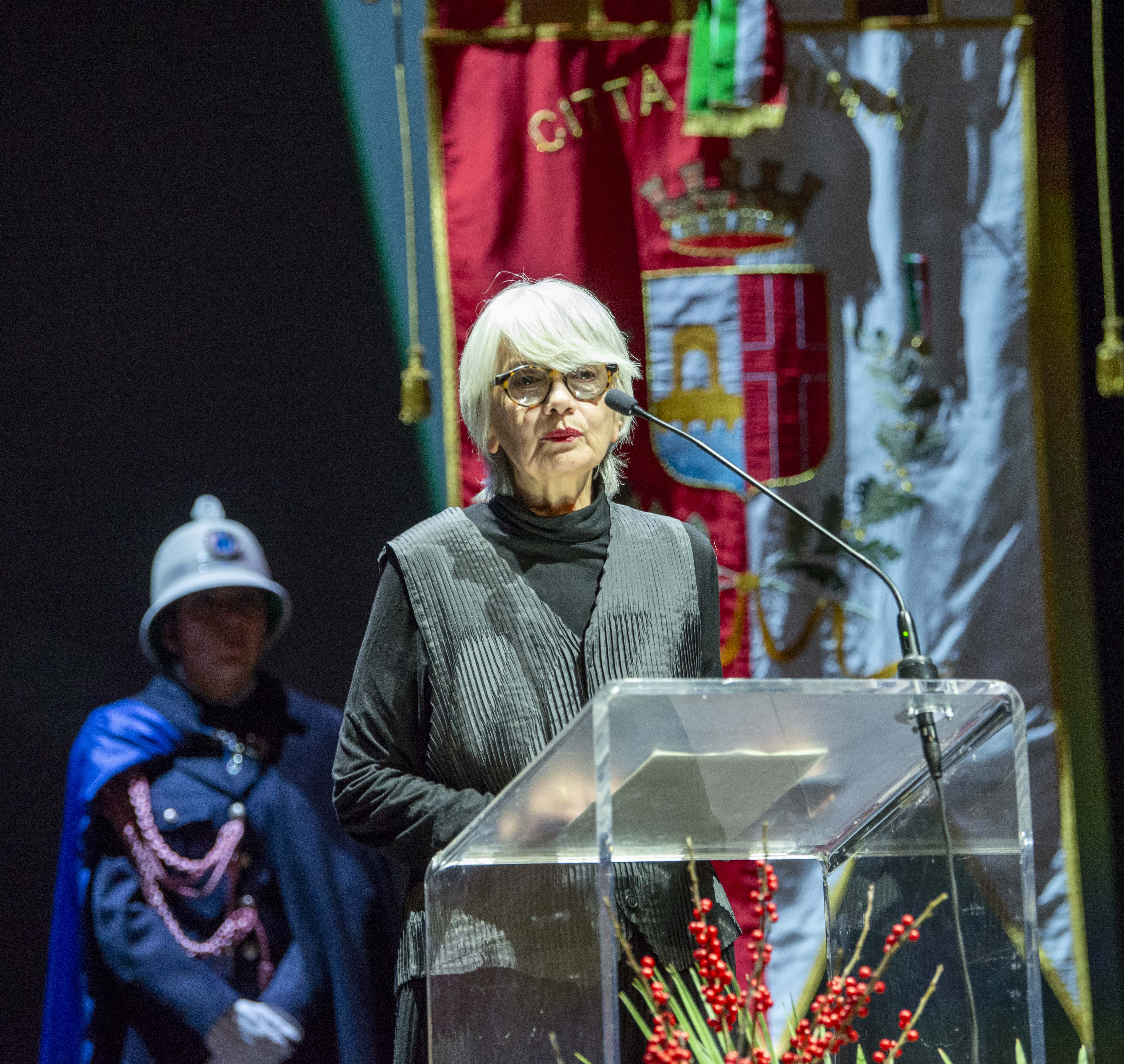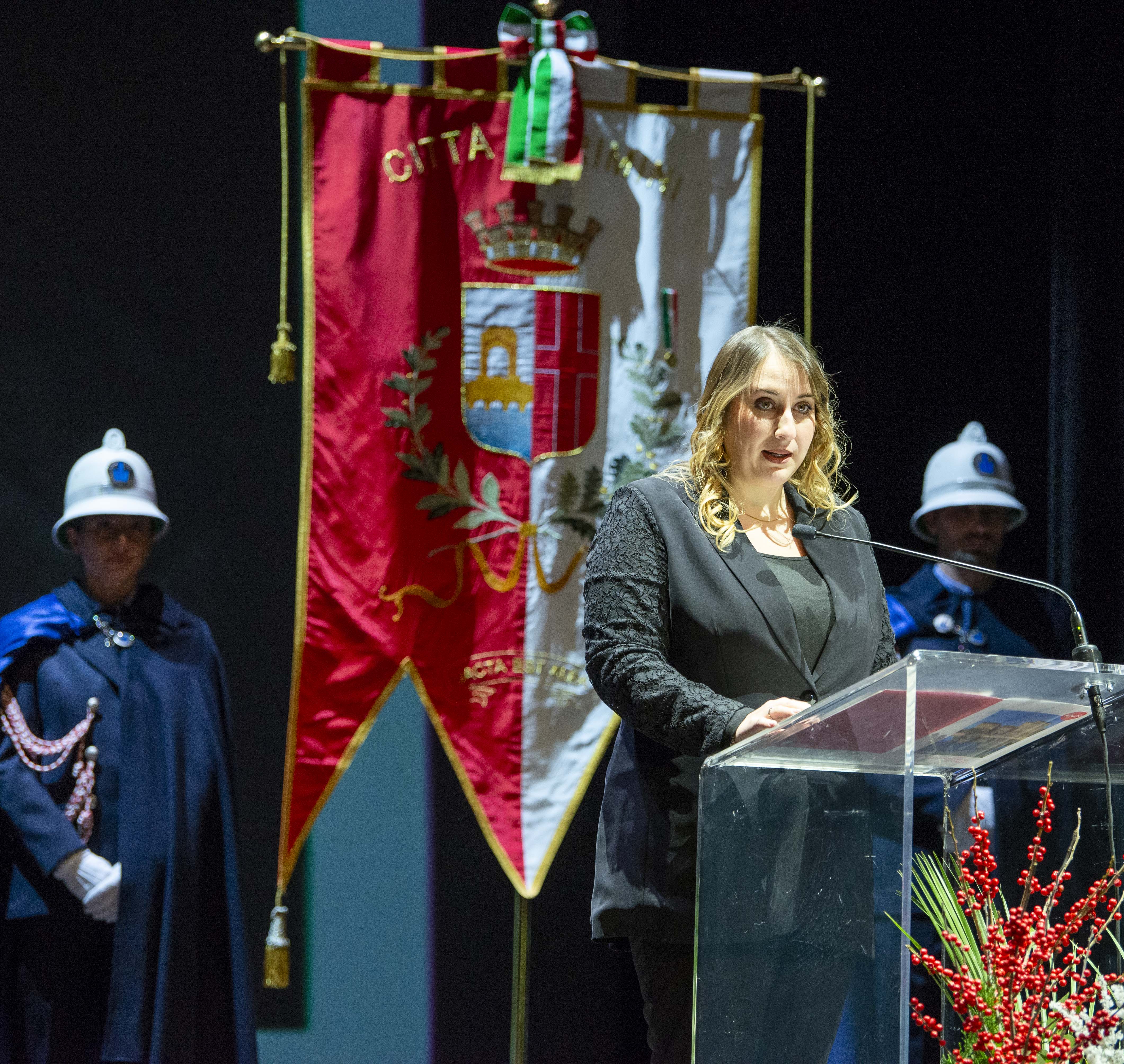 Al termine dell’intervento di saluto di fine anno, la vicesindaca Chiara Bellini ha preso la parola per dare lettura della biografia e della motivazione del Sigismondo d’oro conferito a Mario Guaraldi e ricevuto da Maria Perchiazzi Guaraldi che ha fatto le veci del marito.