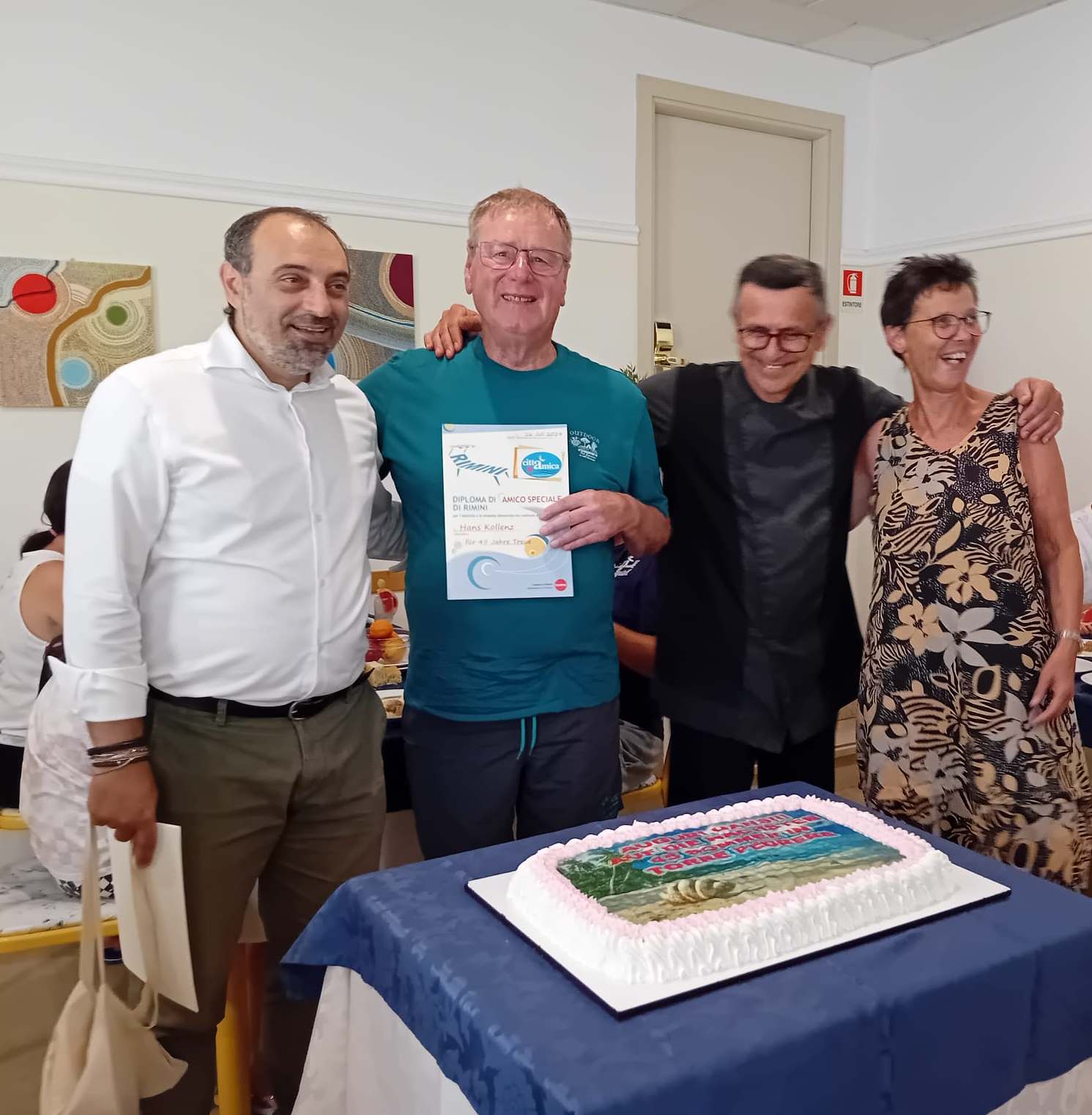 Sono 45 anni che, dall'Austria, Hans Kollenz sceglie di passare le sue estati a Torre Pedrera in compagnia della famiglia, da quest'anno allargata alla 4° generazione con l'arrivo del primo pronipote. L'hotel Aros di Torre Pedrera, dove Hans Kollenz soggiorna da 38 anni, ha voluto festeggiare con il suo ospite, oramai amico, questo traguardo e, alla presenza dell'assessore Juri Magrini, consegnare l'attestato di turista affezionato a Rimini.