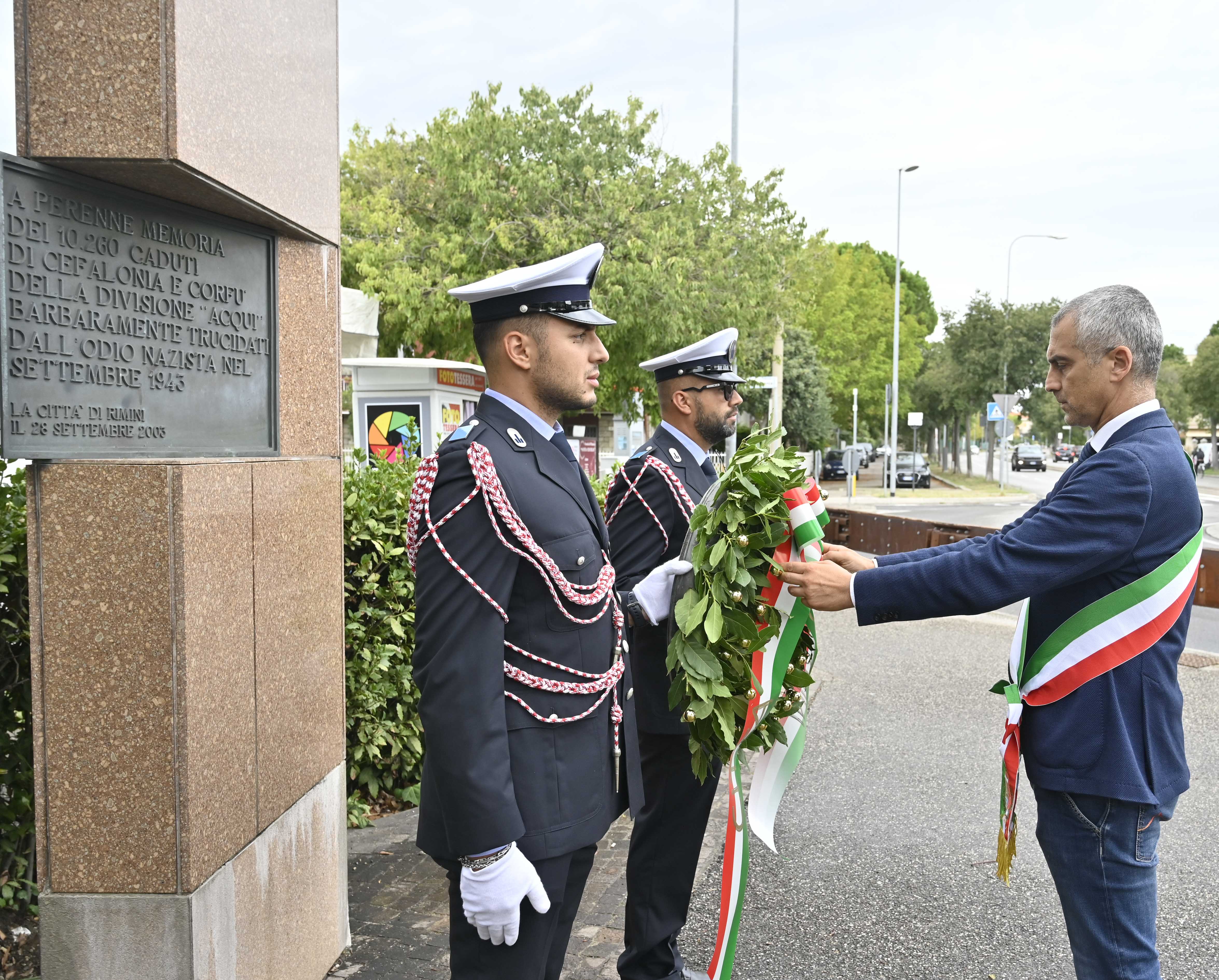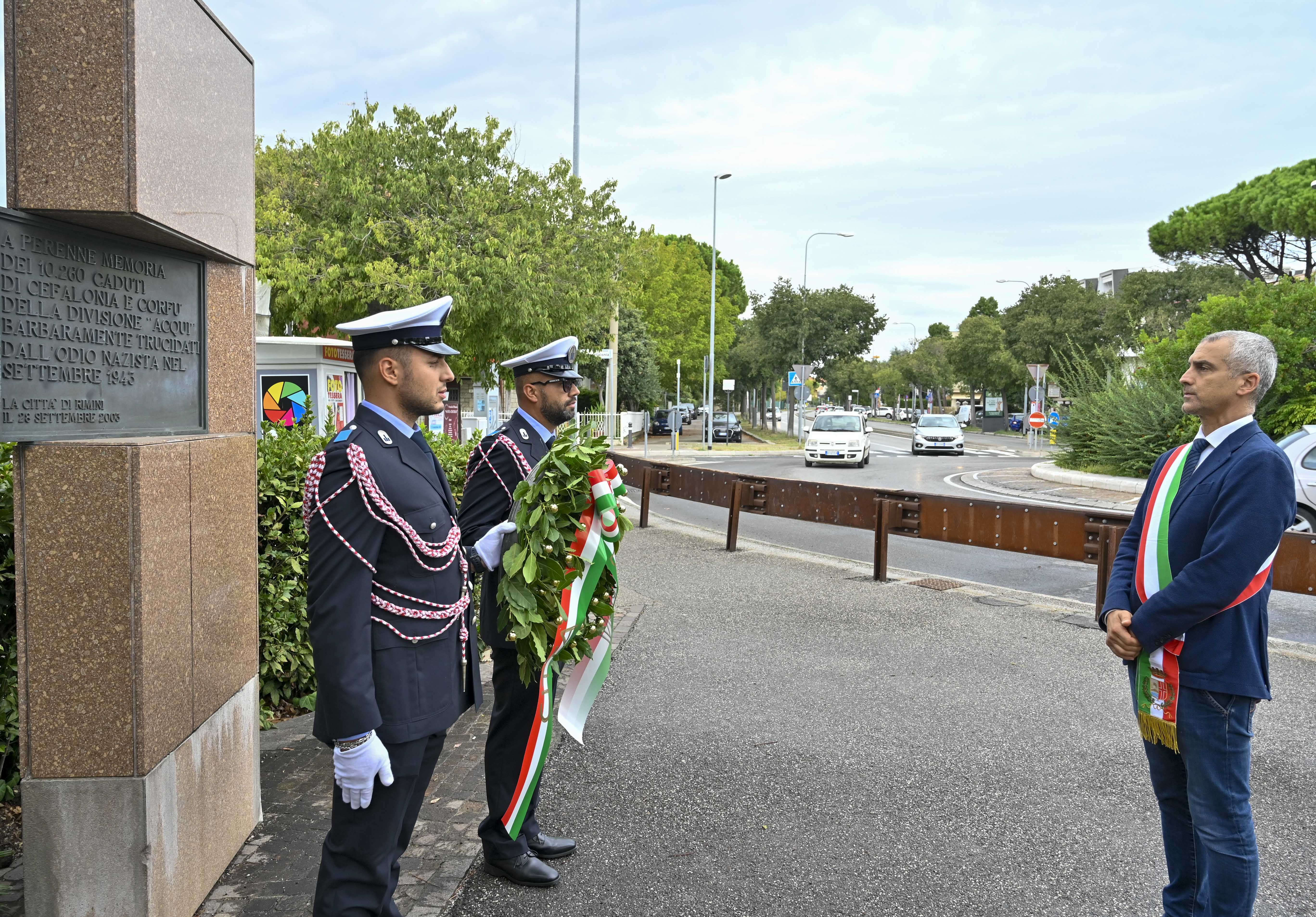 Prima delle due cerimonie per il 79° Anniversario della Liberazione di Rimini, il Sindaco Jamil Sadegholvaad ha deposto una corona di alloro in piazzale Caduti di Cefalonia, ai piedi del monumento - realizzato nel 2003 dal Comune di Rimini - in onore dei 10.260 soldati italiani della Divisione Acqui trucidati a Cefalonia e Corfù dall'esercito tedesco nel mese di settembre 1943, in occasione dell’80° Anniversario di quella strage.