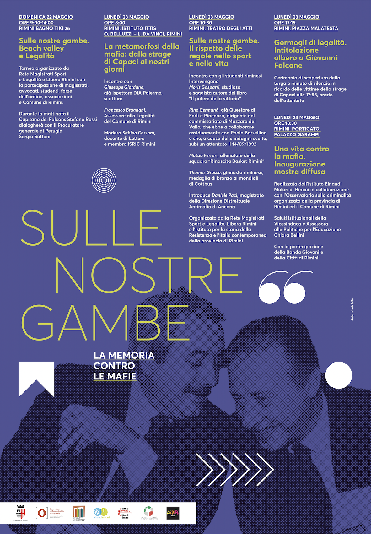 Sono due dei momenti più significativi inseriti nella rassegna di eventi denominata "Sulle nostre gambe. La memoria contro le mafie” organizzati in occasione del trentennale della strage di Capaci, dal Comune di Rimini in collaborazione con l’Osservatorio sulla criminalità organizzata della provincia di Rimini, l’Istituto per la storia della Resistenza e dell’Italia contemporanea della provincia di Rimini, l’Associazione Magistrati Sport & Legalità e Libera Rimini, le scuole superiori “Einaudi – Molari” e “Belluzzi – Da Vinci”.