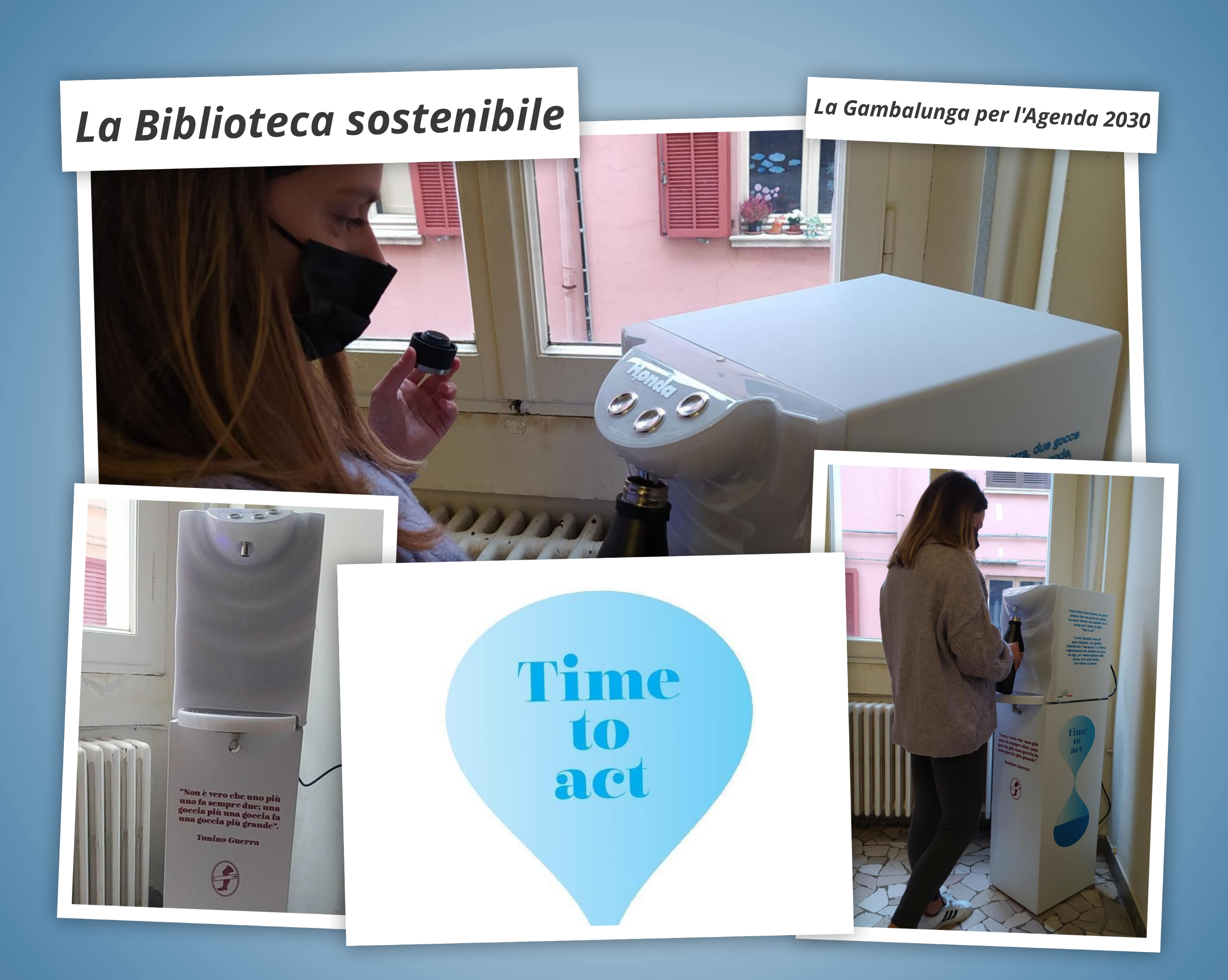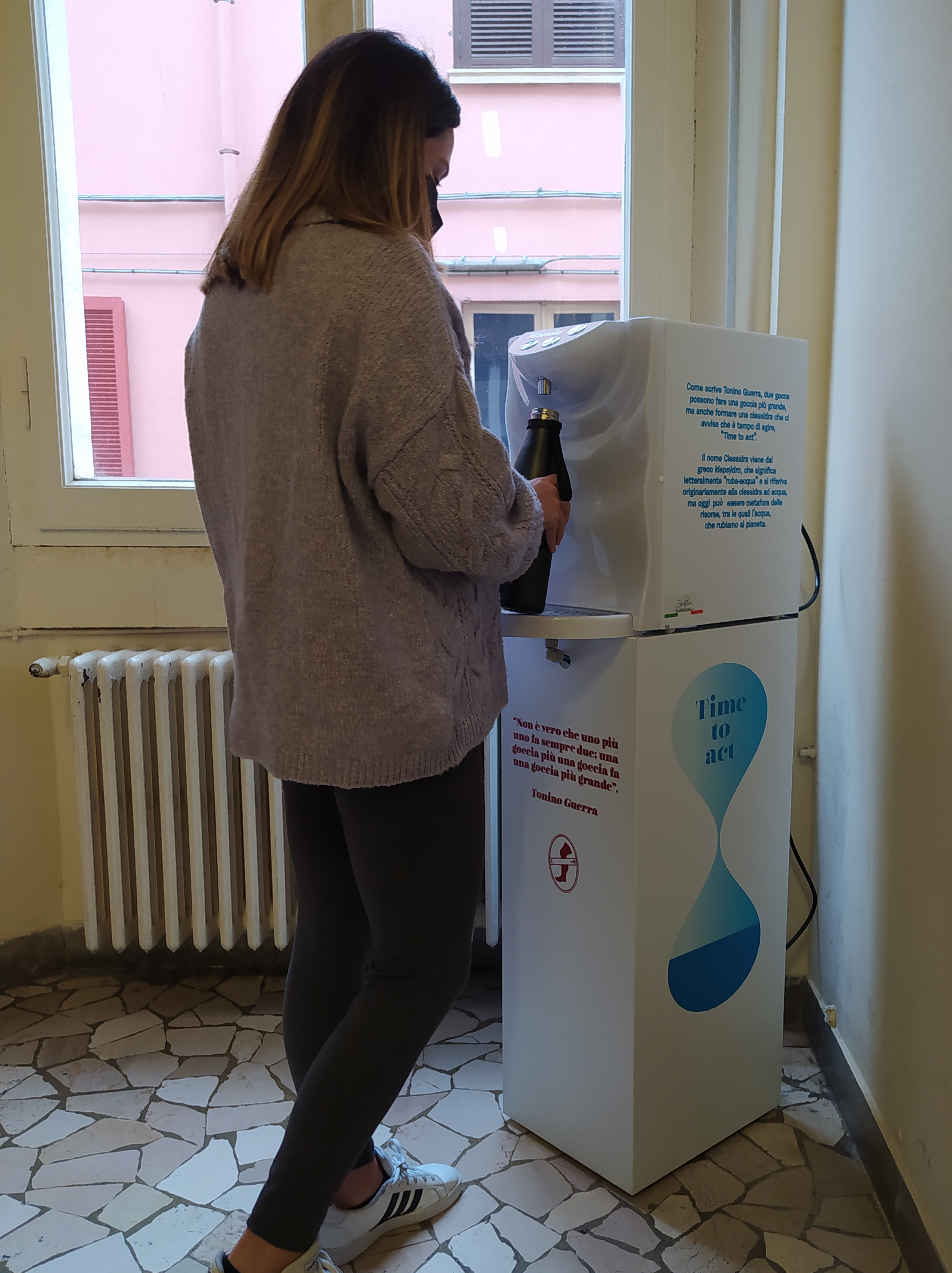 L’erogatore è stato personalizzato con un logo (una clessidra formata da due gocce con il messaggio “Time to act”) ed un richiamo al sesto obiettivo 6 dell’Agenda ONU: “Garantire a tutti la disponibilità e la gestione sostenibile dell’acqua”.