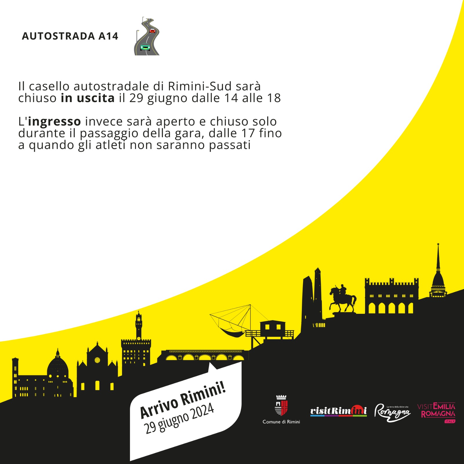 Il casello autostradale di Rimini-Sud sarà chiuso, in uscita, sabato 29 giugno dalle ore 14 alle ore 18 (e comunque fino a cessate esigenze) mentre, in entrata, resterà aperto ad eccezione del lasso di tempo fra le ore 17 e il passaggio della gara, quando verranno chiuse le vie di accesso e pertanto il casello autostradale non sarà accessibile.