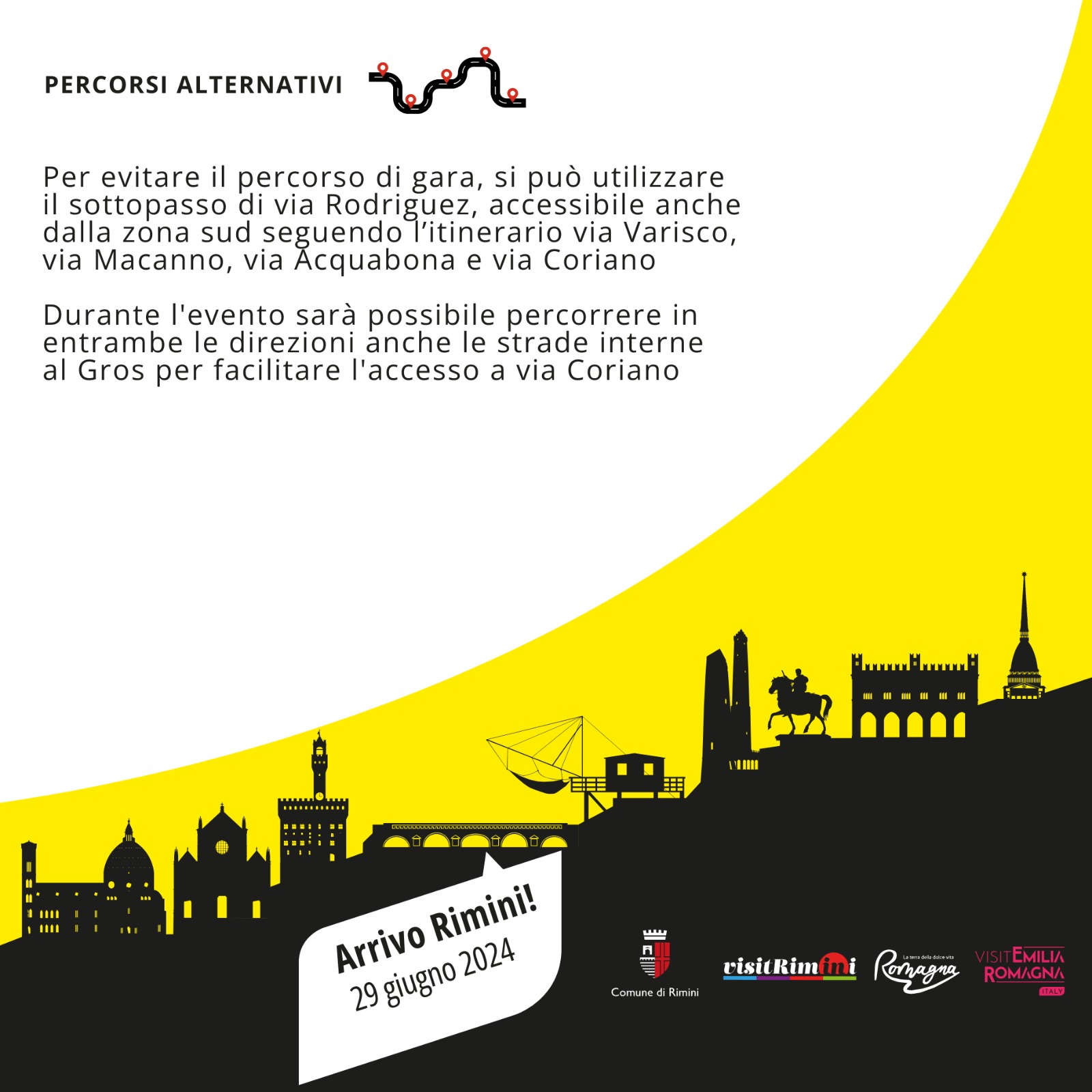 Per bypassare il percorso di gara, potrà essere utilizzato il sottopasso di via Rodriguez, raggiungibile anche dalla zona sud attraverso l’itinerario via Varisco-via Macanno-via Acquabona-via Coriano.