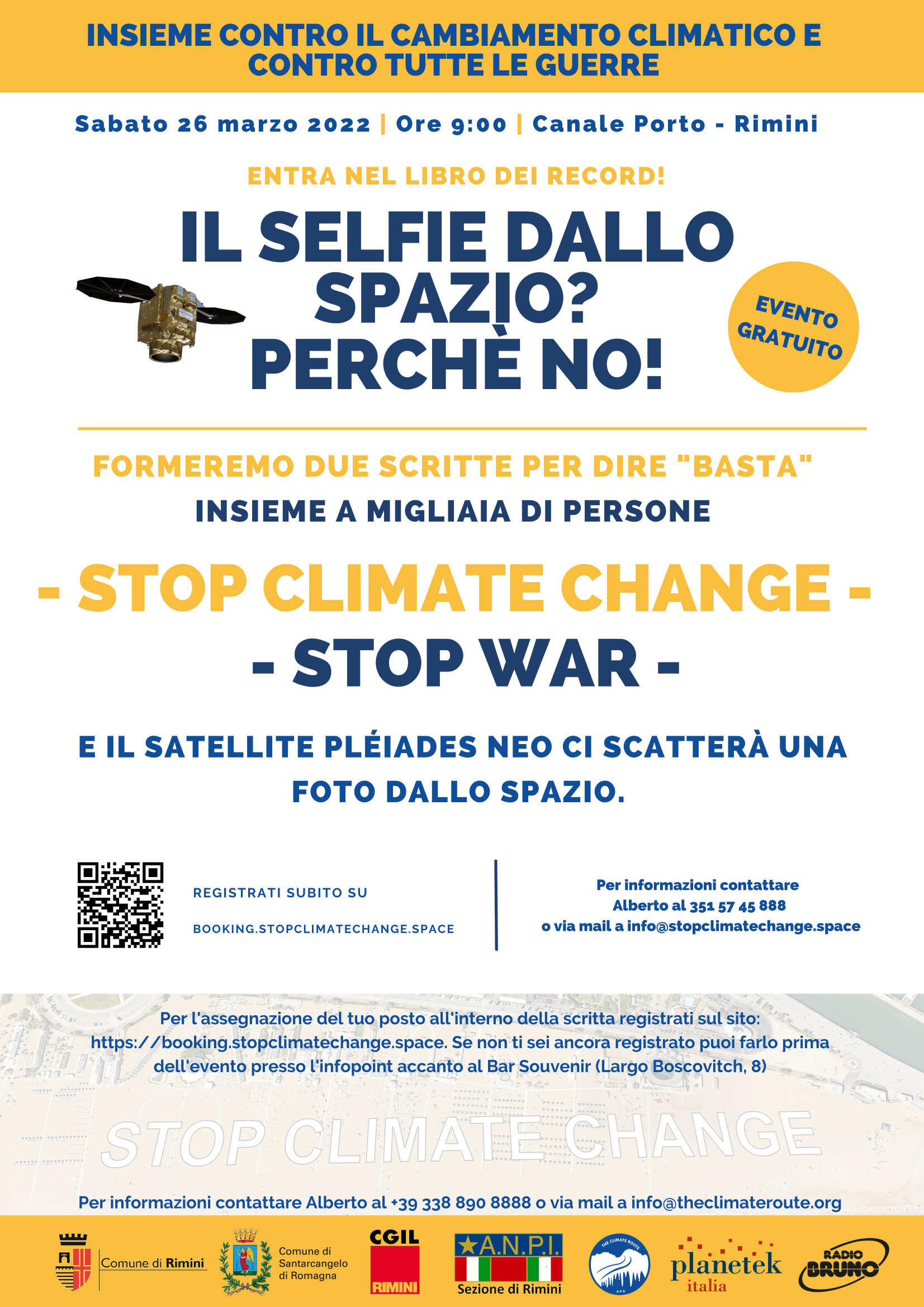 Sabato 26 marzo sulla spiaggia di Rimini è in programma un selfie dallo spazio con lo scopo di sensibilizzare il più ampio numero di persone sui cambiamenti climatici e sui suoi effetti e contro tutte le guerre. Alle 11.02 di sabato, infatti. il satellite Pléiades Neo transiterà a 620 km dalla Terra in corrispondenza delle spiagge di Rimini e lì fotograferà dal cielo le parole chiave 'STOP CLIMATE CHANGE' e ‘STOP WAR’ le scritte formate dalle persone che si disporranno sulla battigia. Tutti possono partecipare (registrazione su https://booking.stopclimatechange.space)