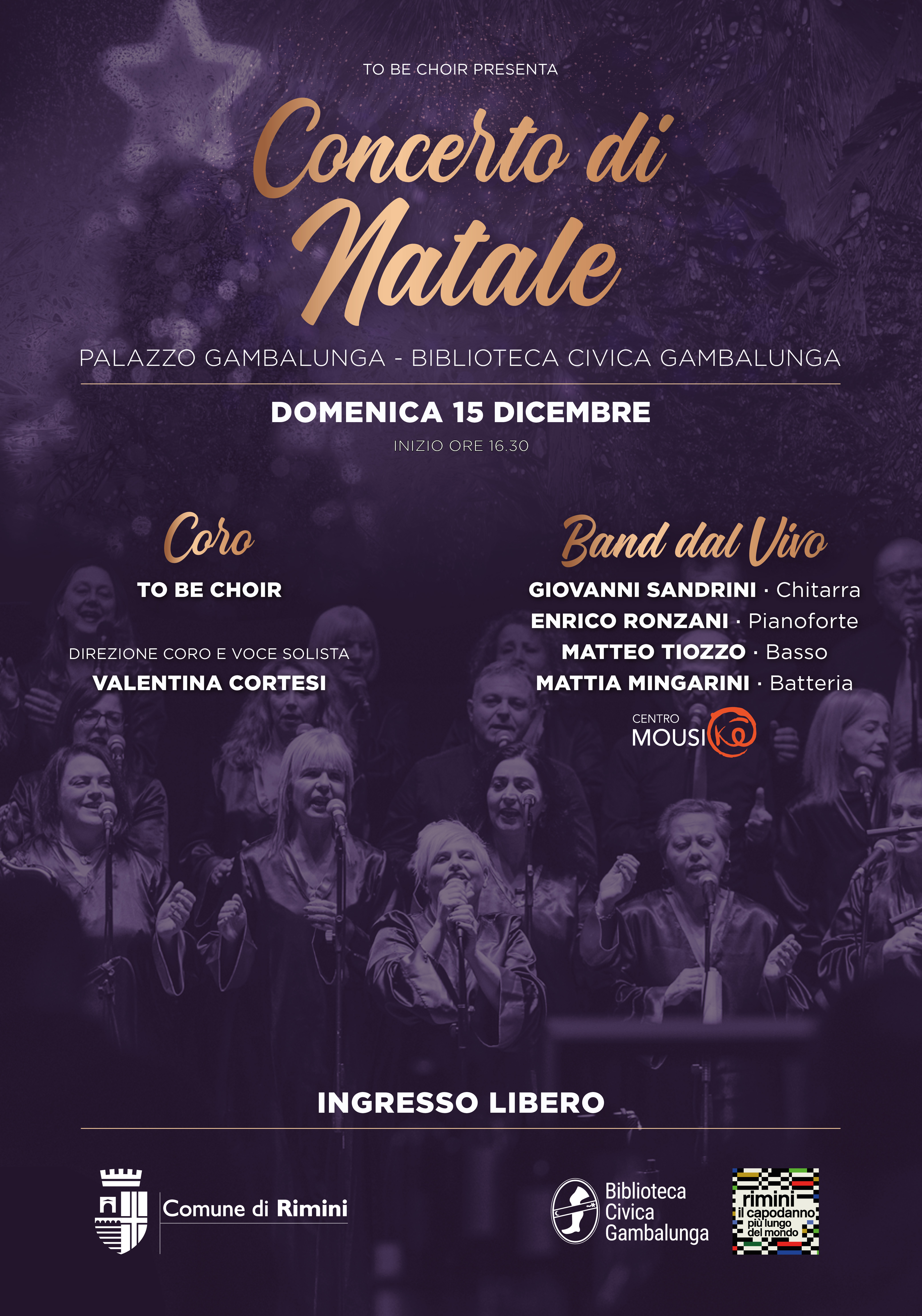 Domenica 15 dicembre 2024, a partire dalle ore 16.30, la corte di palazzo Gambalunga risuonerà delle note natalizie di un concerto Gospel con il coro To Be Choir, diretto da Valentina Cortesi. Oltre alle più famose canzoni natalizie, il repertorio prevede brani tradizionali Gospel e Spiritual con contaminazioni dal pop al rock passando per il jazz. Un percorso musicale che esplora la sfera più spirituale e profonda della black music: ritmi e armonie molto vicini a soul, blues, R&B e funk, una musica coinvolgente per tutti e in grado di cogliere e comunicare il senso e l’intima spiritualità della Natività.