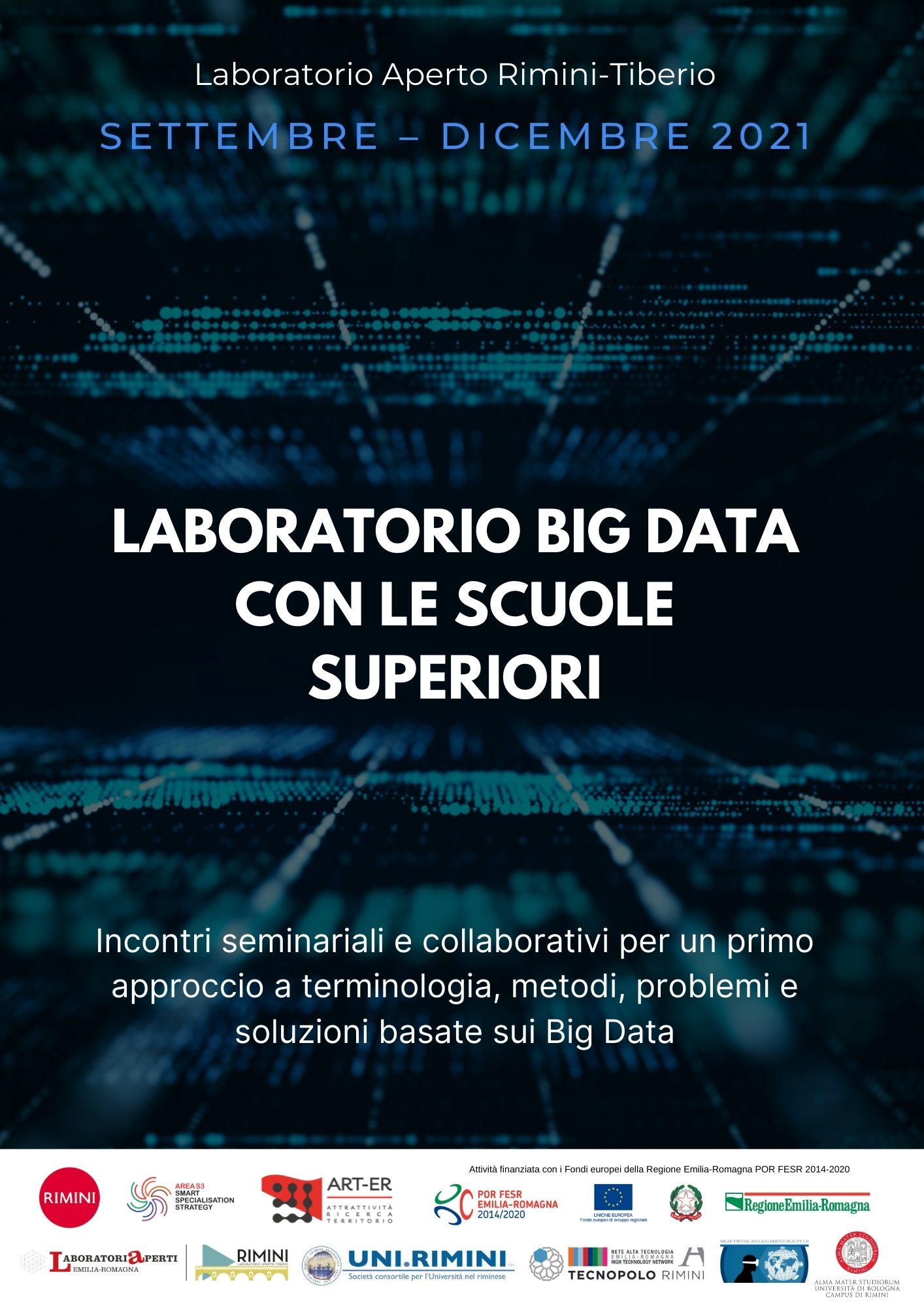 Il progetto è promosso dal Laboratorio Aperto Rimini-Tiberio in collaborazione con Uni.Rimini, il Comune di Rimini, il Campus di Rimini dell’Università di Bologna e Art-ER. Il “Laboratorio Big Data” è rivolto alle studentesse e agli studenti delle scuole secondarie del Comune di Rimini che intendono apprendere tecniche di elaborazione ed analisi dei dati di grandi dimensioni (BIG DATA). Si pone, quindi, l’obiettivo di diffondere la conoscenza dei big data tramite un approccio seminariale e collaborativo con gli studenti degli istituiti scolastici superiori sui fondamenti dell’analisi dei dati di grandi dimensioni.