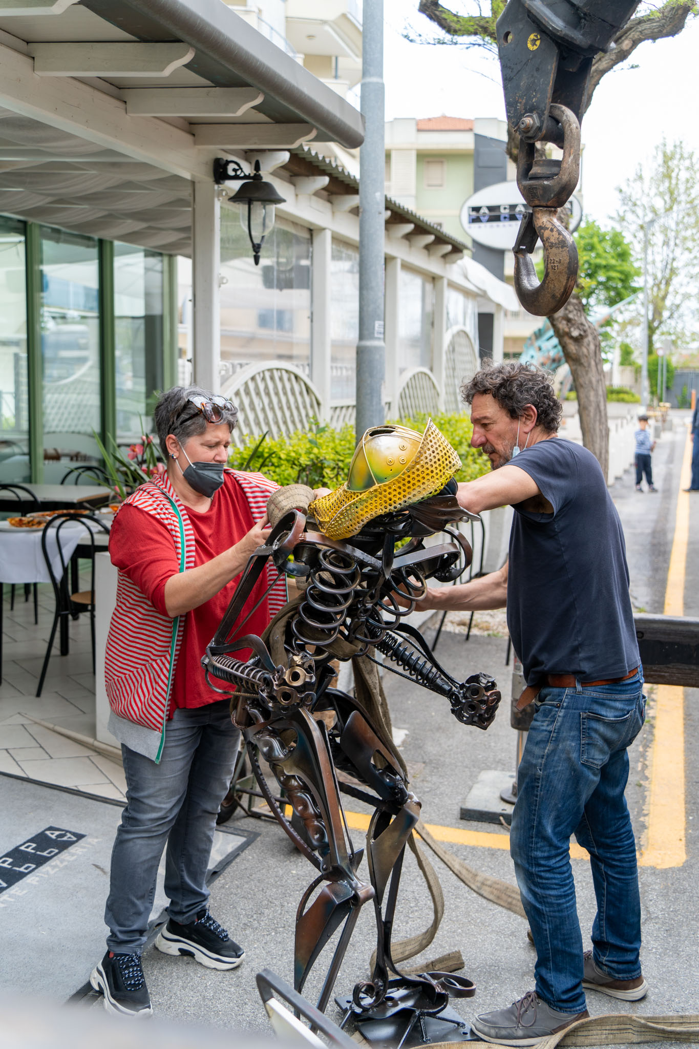 Un imponente ‘marlin’ in metallo che svetta a San Giuliano, all’angolo tra viale Ortigara e via Briolini, preso all’amo da un pescatore, realizzato con materiale di recupero saldato a mano, installato sulla vetta di un edificio. È iniziato ieri mattina il montaggio dell’installazione artistica che Massimo Buldrini, titolare dello storico ristorante La Cappa, ha deciso di regalare alla città e alla ‘sua’ San Giuliano. L’installazione è composta da due opere, acquistate e commissionate dal privato: la prima è una grande scultura in metallo di circa 8,70 metri di larghezza e 5.15 metri di altezza che rappresenta un pesce spada realizzato dall’artista Mauro di Giovanni e dipinto e restaurato da Andrea Gisenti della "Mutoid Waste Company". L’opera è posizionata su un’area sottoposta al vincolo di tutela paesaggistica ed è stata valutata favorevolmente dalla Soprintendenza. È invece firmata da Lu Lupan, storica e affermata artista dei Mutoid, la scultura che raffigura un pescatore, posizionata sul terrazzo all’ultimo piano dell’edificio di via Briolini 13, un’opera unica e dall’elevato valore artistico, realizzata con materiale di recupero magistralmente saldato a mano.