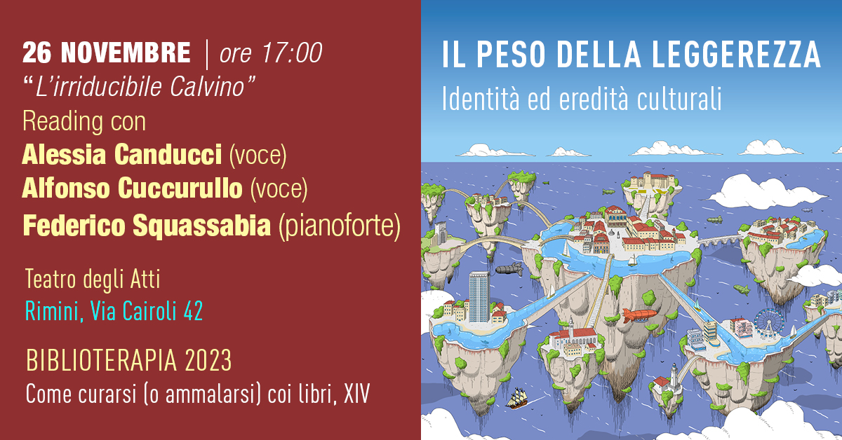 Tra i più apprezzati interpreti del teatro di narrazione per ragazzi, i tre artisti si cimenteranno in questa occasione con un reading destinato al pubblico adulto di Biblioterapia, che avrà la forma di un viaggio tra le suggestioni disseminate nelle pagine dello scrittore, in compagnia di alcuni dei suoi personaggi e della sua scrittura. Adottando una chiave di lettura che non ‘riduce’ la sua produzione letteraria ad un solo momento, cercando al tempo stesso di evitare la frammentarietà, gli autori, con la guida di Roberta Favia, hanno scelto di dare spazio alla superficie e alla profondità insieme. Così il reading passa per lo spaesamento di Marcovaldo al Supermarket, tocca una parte dell’incipit di Se una notte d’inverno un viaggiatore, Le Cosmicomiche, Il Barone Rampante, le Città invisibili, Palomar. Le musiche eseguite dal vivo e composte per lo spettacolo dal musicista Federico Squassabia permetteranno di entrare in contatto, anche emotivamente, con la condizione dell’uomo sospeso tra la tensione verso l’altezza e la prosaicità del quotidiano.