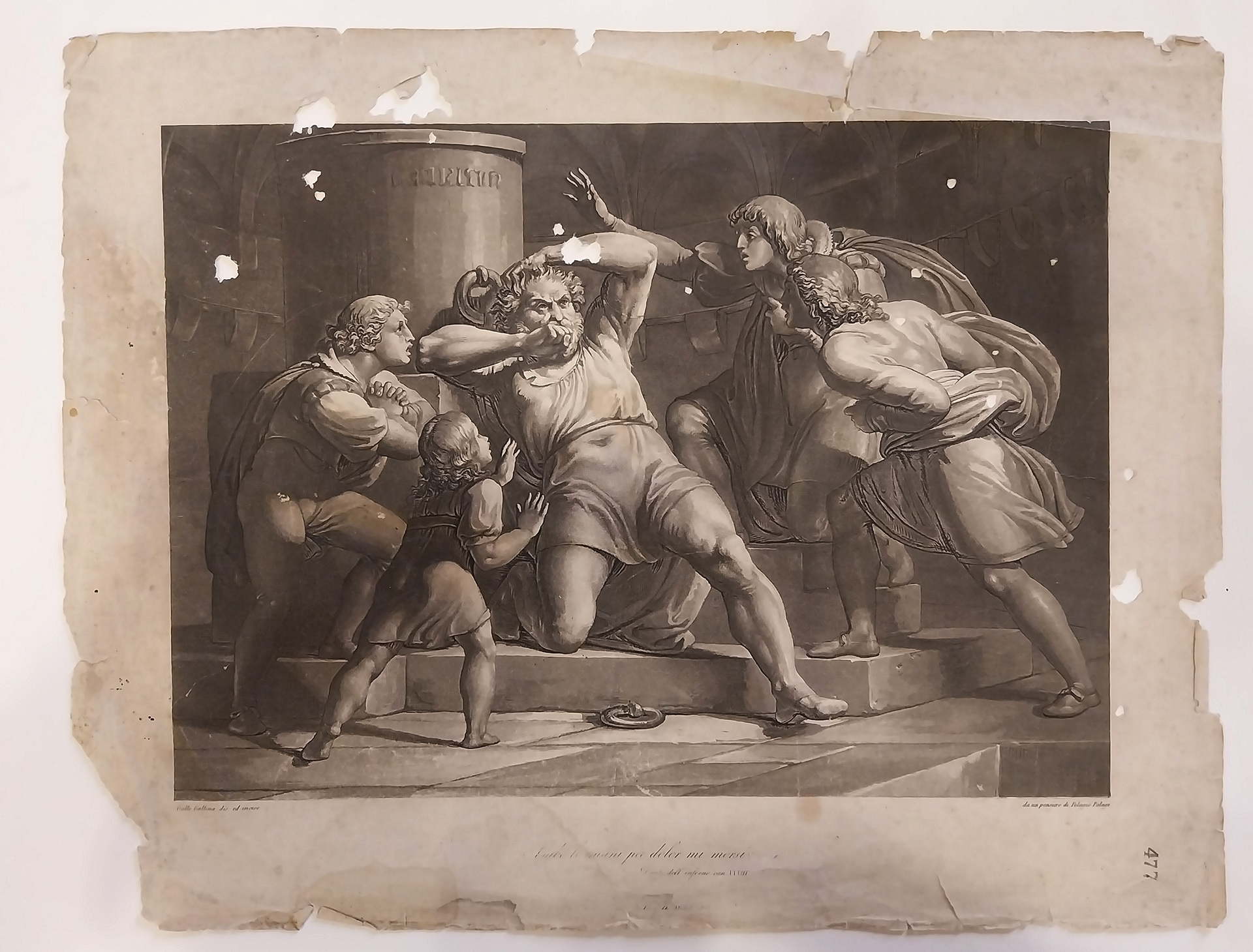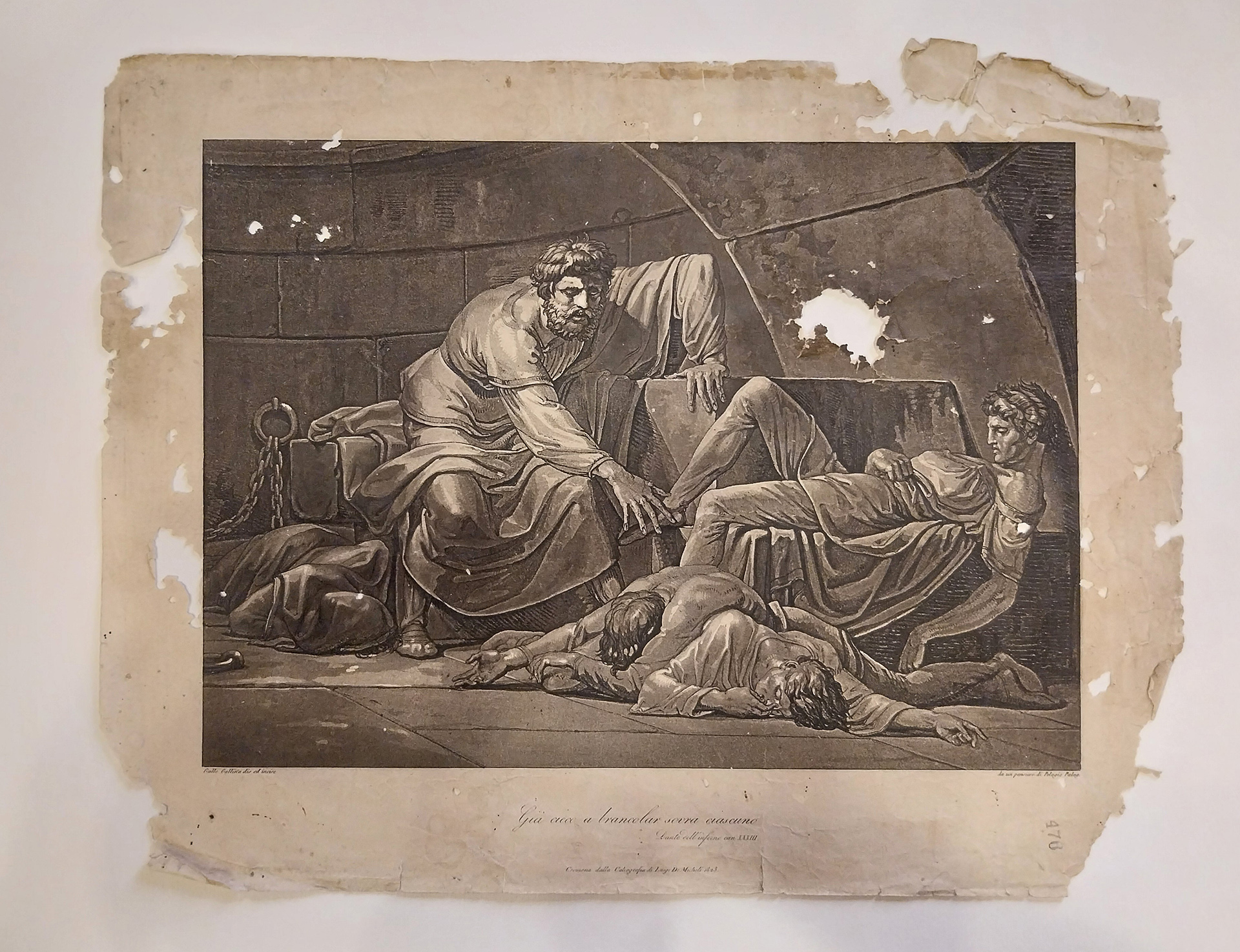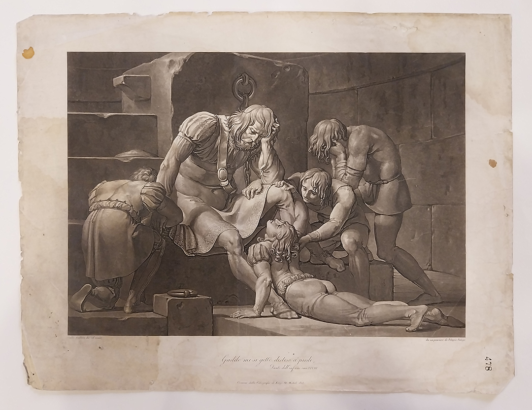 Le tre incisioni di Gallo Gallina, allievo del celebre Pelagio Palagi, rappresentano il Conte Ugolino della Gherardesca, figura tragica dell’Inferno dantesco, collocata nel IX cerchio dell’Inferno. Con un'intensità chiaroscurale notevole, Gallina rende il dramma di Ugolino, condannato a morire di fame nella Torre della Muda con i figli e i nipoti. Le incisioni, fedeli ai toni degli acquerelli originali, mostrano un equilibrio tra verità storica e pathos poetico, ispirandosi ai grandi interpreti danteschi Flaxman e Kock. Attualmente le acquatinte presentano macchie, lacerazioni e erosioni causate da insetti xilofagi. Il restauro prevede una depolveratura, il lavaggio in acqua deionizzata, e il ripristino del pH per neutralizzare l’acidità, che provoca indebolimento delle fibre e imbrunimento della carta, con conseguenze strutturali.