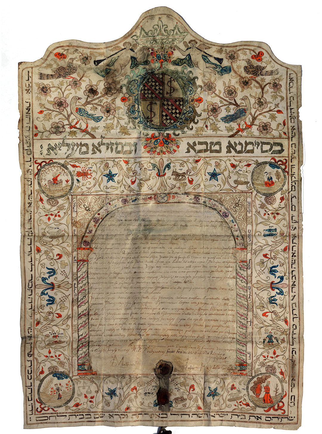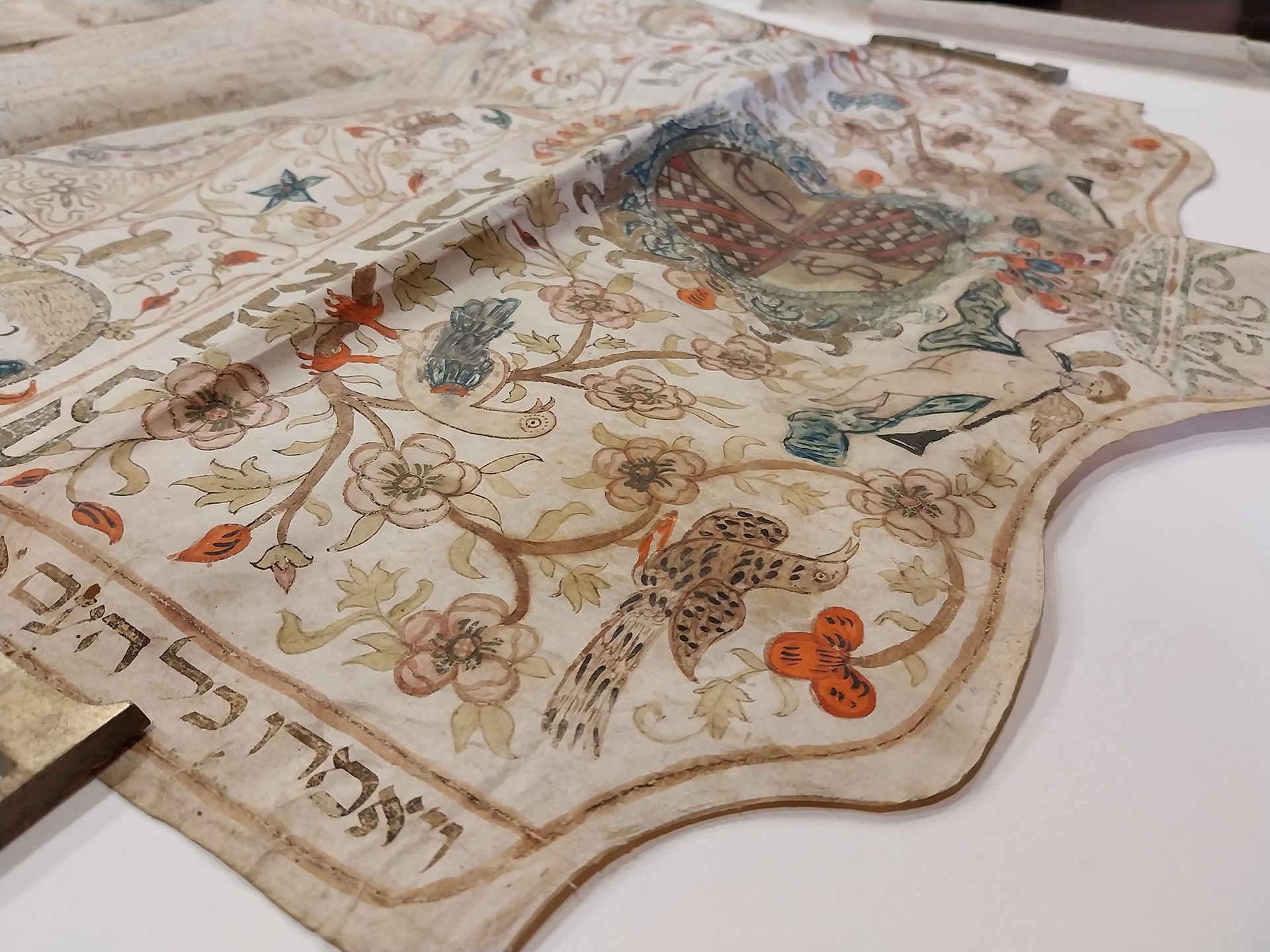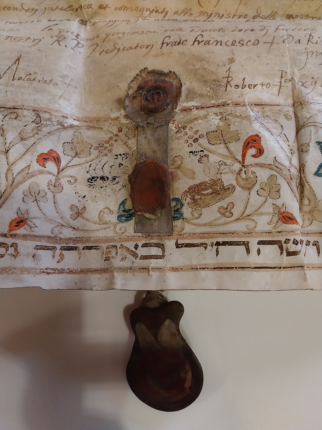 L’intervento conservativo riguarderà una Ketubah, un contratto matrimoniale ebraico di grandi dimensioni, finemente decorato con oro e colori vivaci. Questo straordinario documento, riutilizzato nel Settecento, presenta un testo in volgare circondato da un'elegante cornice con allegorie stagionali agli angoli. Sopra la scrittura originale erasa compare un testo datato maggio 1457, firmato da Sigismondo Malatesta e da alcuni frati inquisitori, un'aggiunta settecentesca che arricchisce la stratificazione storica del documento. In alto, campeggia lo stemma malatestiano su un fregio originale ornato con motivi vegetali di ispirazione veneziana. La pergamena presenta oggi segni di disidratazione, erosioni sui margini e una piccola lacerazione. Inoltre, essendo ripiegata, risulta difficile da aprire. Il restauro prevede una pulizia approfondita, il rinforzo delle lacerazioni, l’integrazione delle erosioni, lo spianamento del documento e il fissaggio delle decorazioni, oltre alla realizzazione di un passe-partout per garantirne una conservazione ottimale.