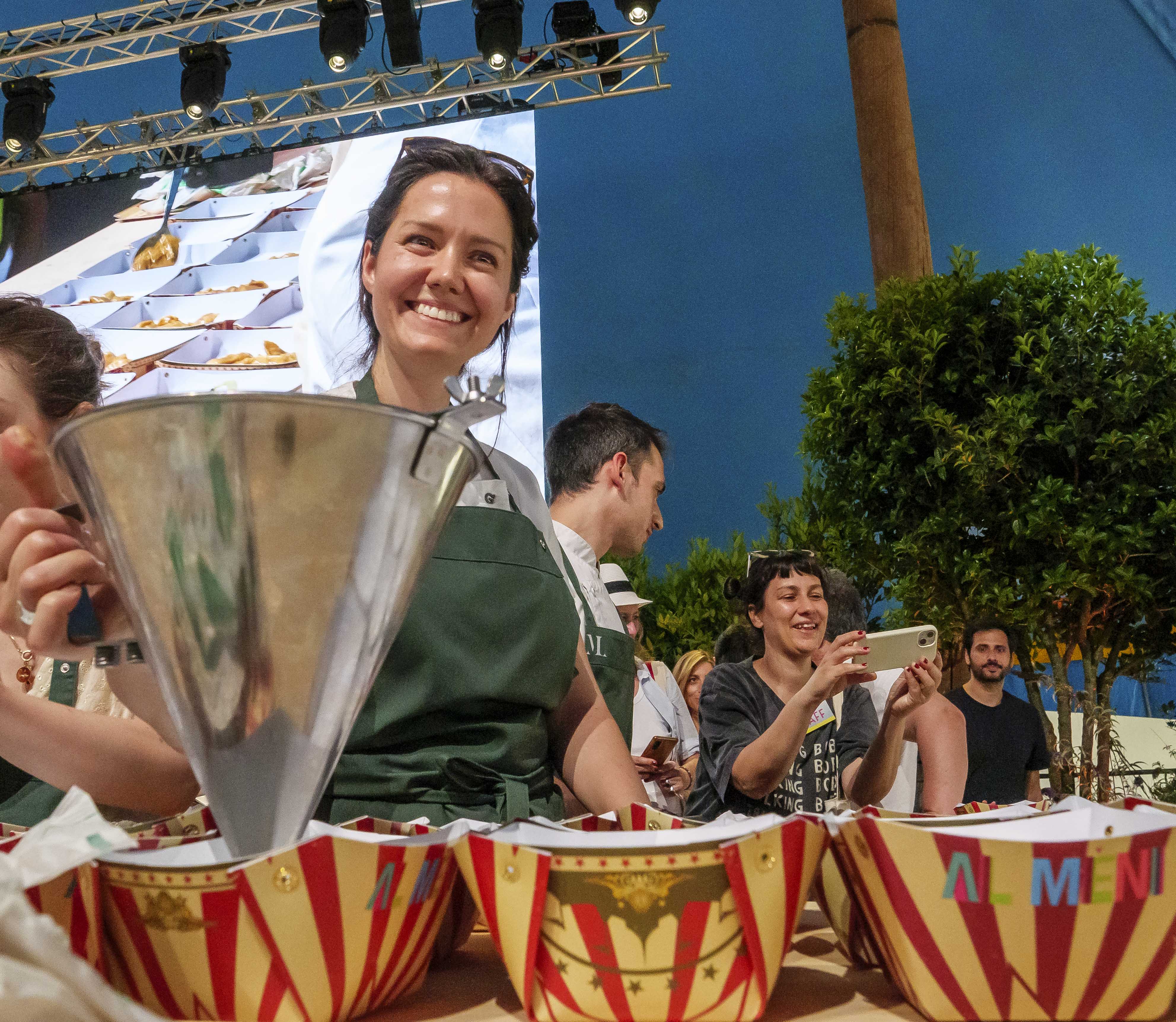 Dopo l’apertura ufficiale, la parola è passata agli chef, con gli showcooking a rotazione nella grande cucina a vista nel circo. All’apertura del tendone, dopo il saluto di Massimo Bottura, la crew della Francescana Family con Jessica Rosval, canadese, head cheffe di Casa Maria Luigia, che ha presentato il suo piatto “Emilia Romagna my love” esclusivamente per Al Meni e dedicato a questa regione: un pane soffice cotto a legna e farcito di ragù di mora romagnola con un pesto di cozze e vongole piccanti da intingere in una salsa di erbe aromatiche e acqua di mare. Quindi terra e acqua che si incontrano per ricordare come i Romagnoli hanno affrontato gli eventi del mese scorso. In contemporanea insieme a lei, il connazionale Allen Huynh, già da diversi anni con un ruolo determinante nella brigata all’Osteria Francescana.